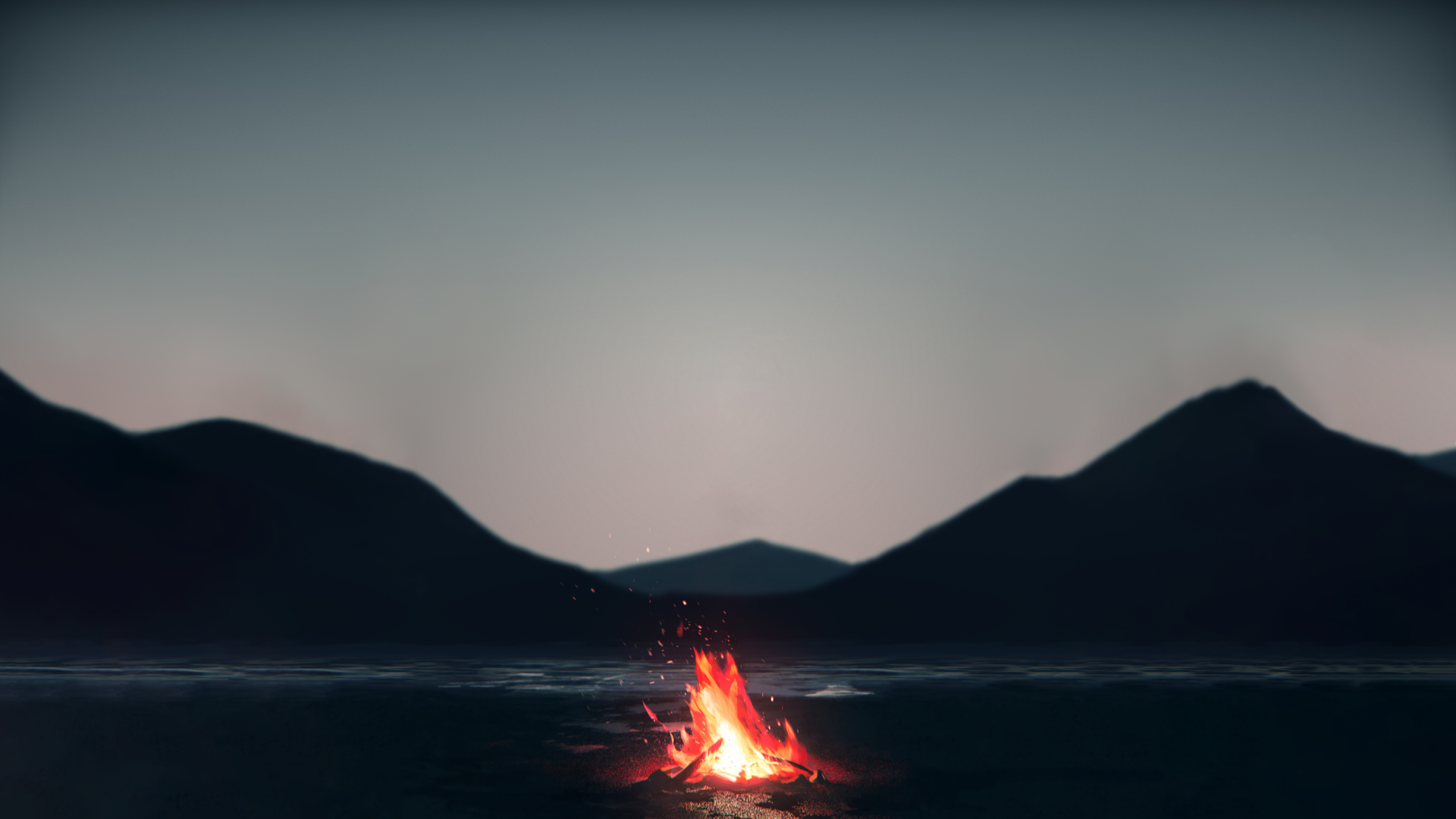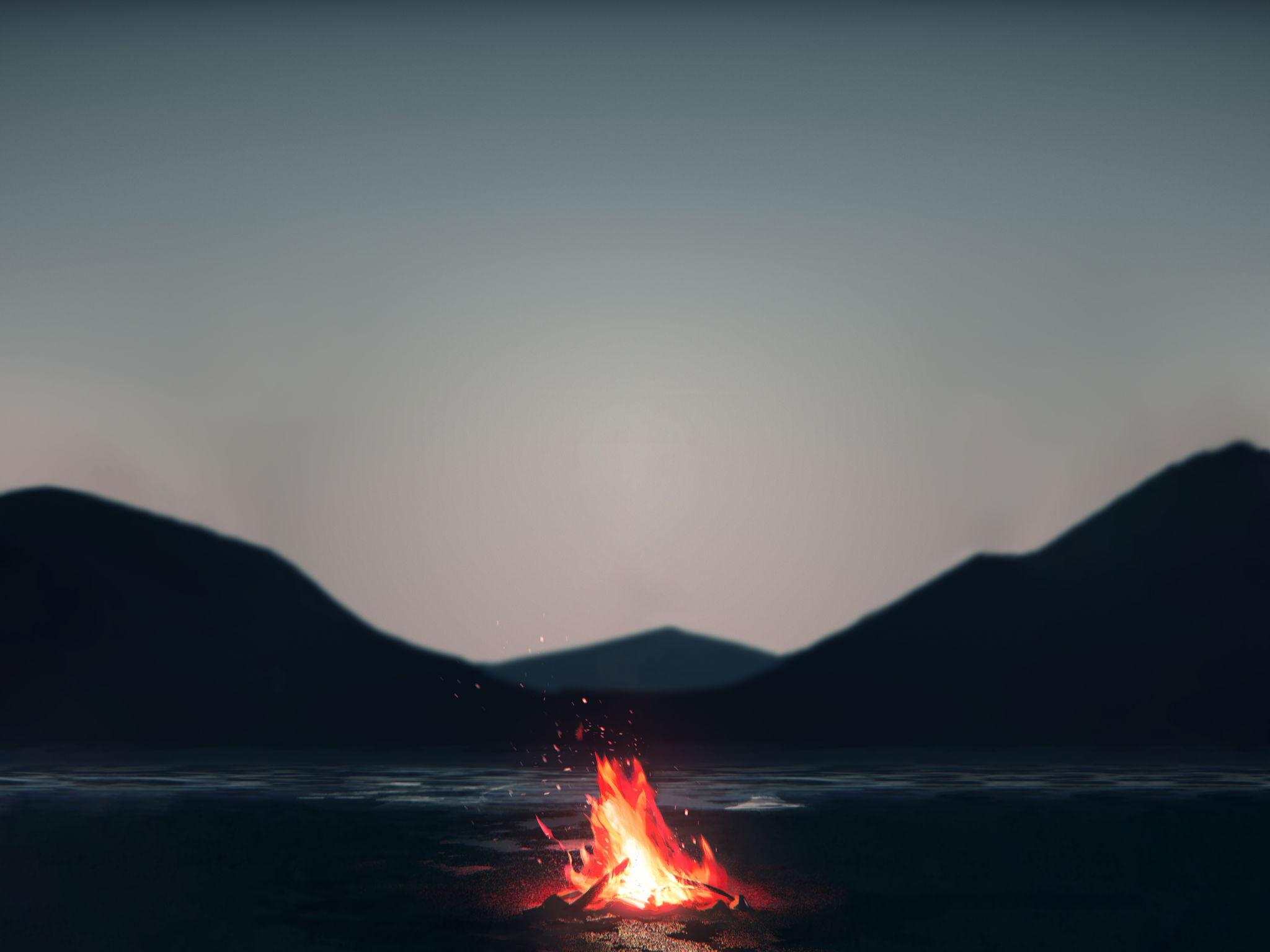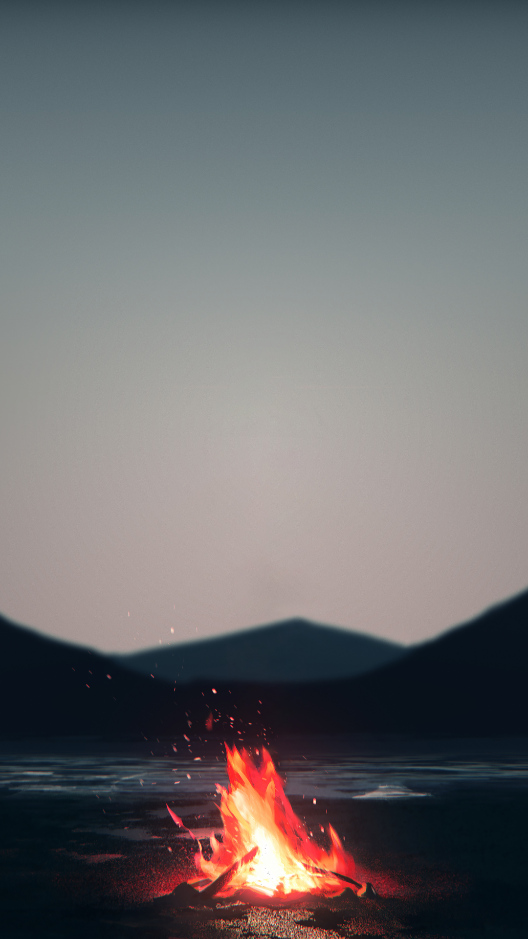 This serene wallpaper features a small campfire on the shore of a tranquil lake, set against the majestic backdrop of mountains. It's an ch…