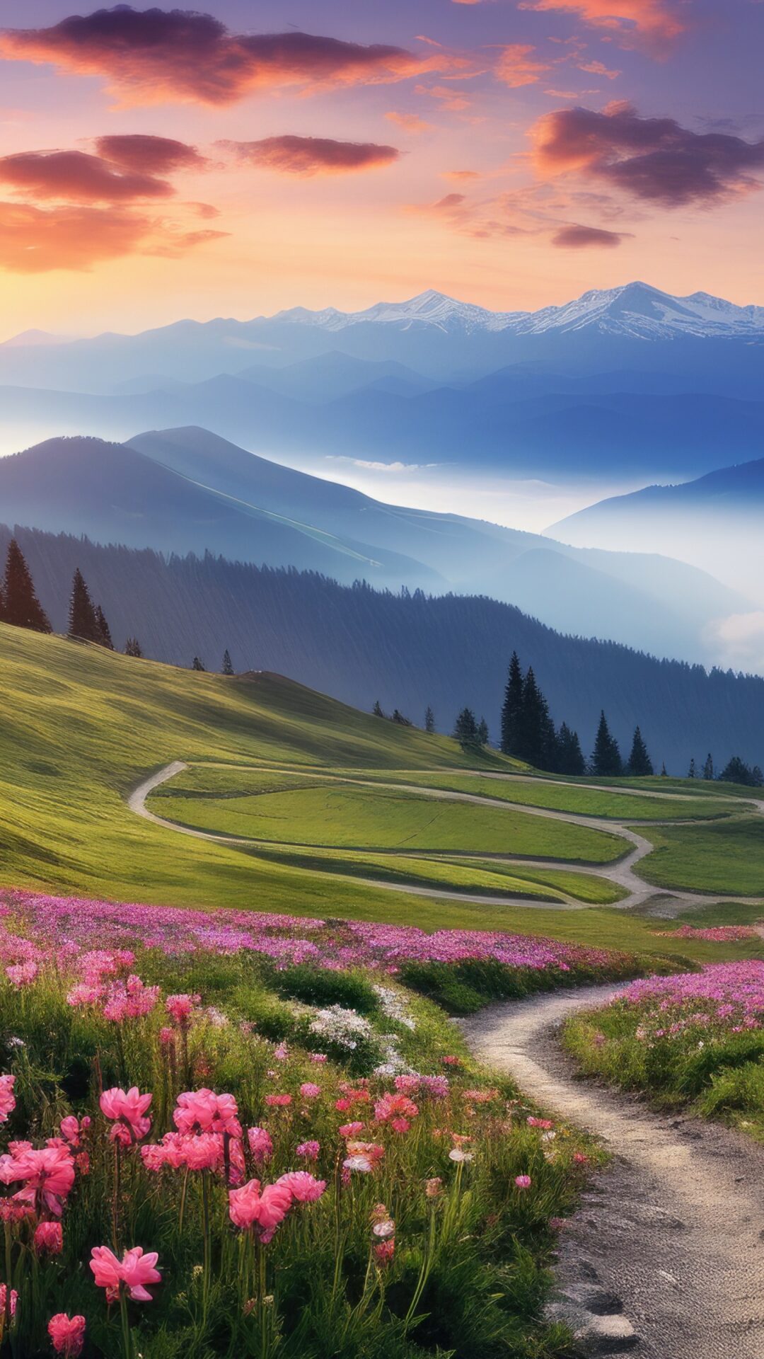 A winding dirt path leads through a hillside meadow toward a distant mountain range. Soft light from the sunset filters through clouds, creating layers of blue and pink in the valleys below.