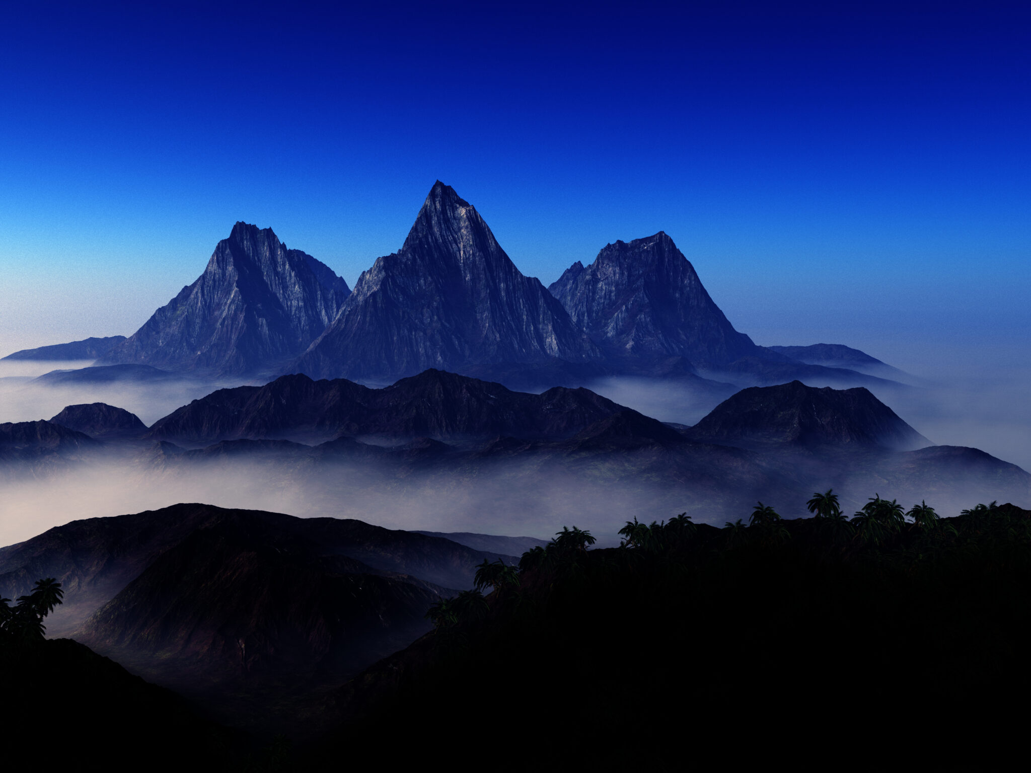 Jagged mountain peaks rise above a dense layer of clouds, creating a dramatic landscape. The dark foreground foliage and cool blue tones sug…