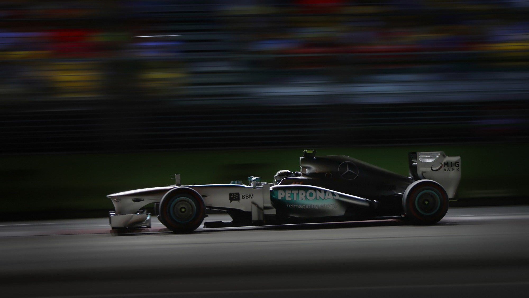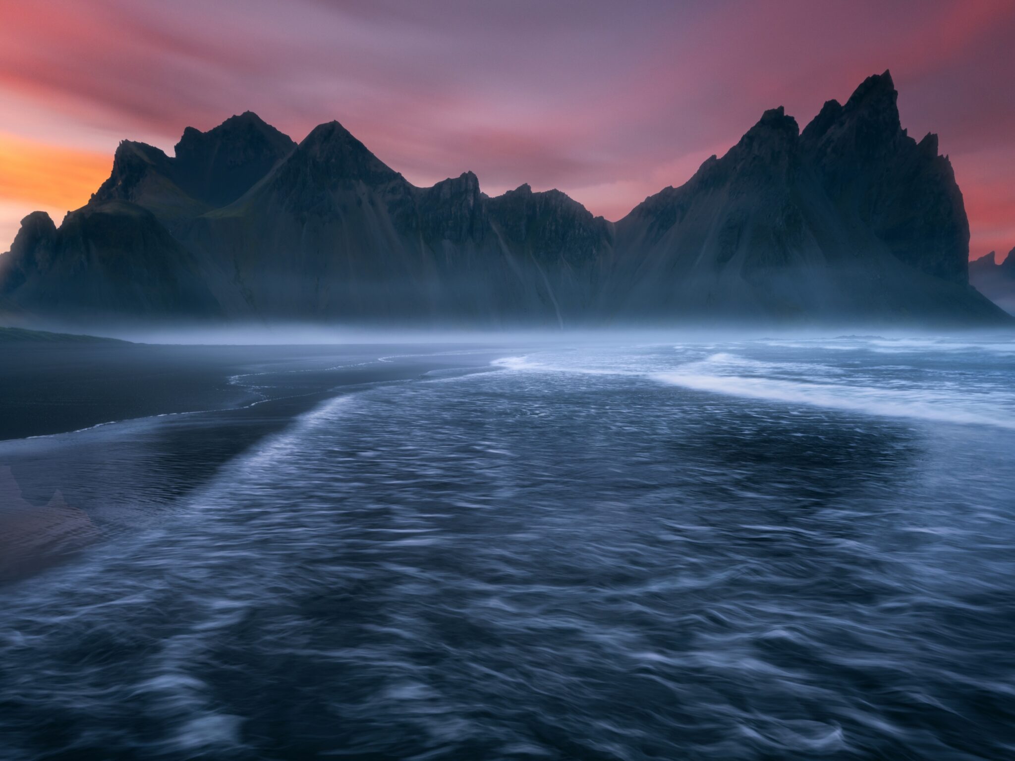A dark coastline meets a range of jagged mountains under a colorful sky. The long exposure creates smooth, swirling textures in the shallow …