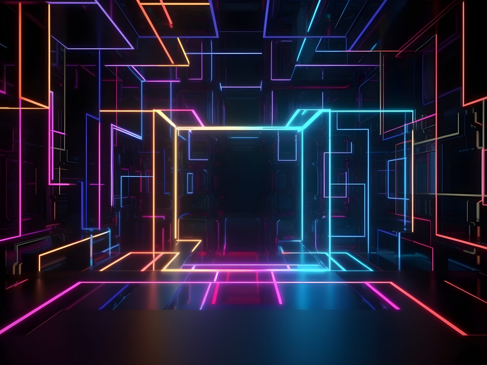 A dark room is outlined with a complex network of glowing neon lines. The light creates a strong sense of depth and reflections on the dark