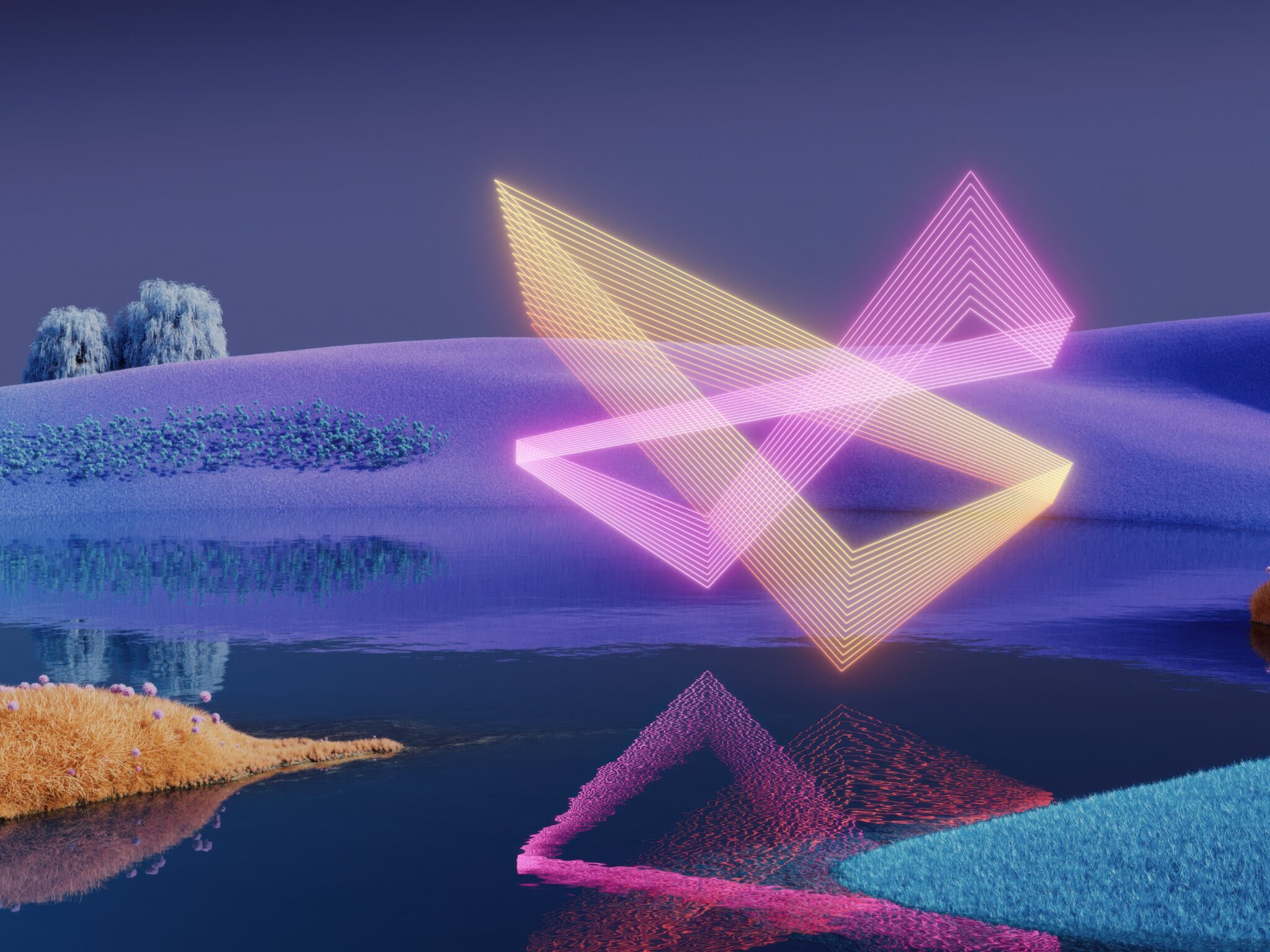 A glowing geometric form floats above a still body of water surrounded by textured terrain. The scene has a cool, dark blue atmosphere contrasted by warm pink and yellow light reflections.