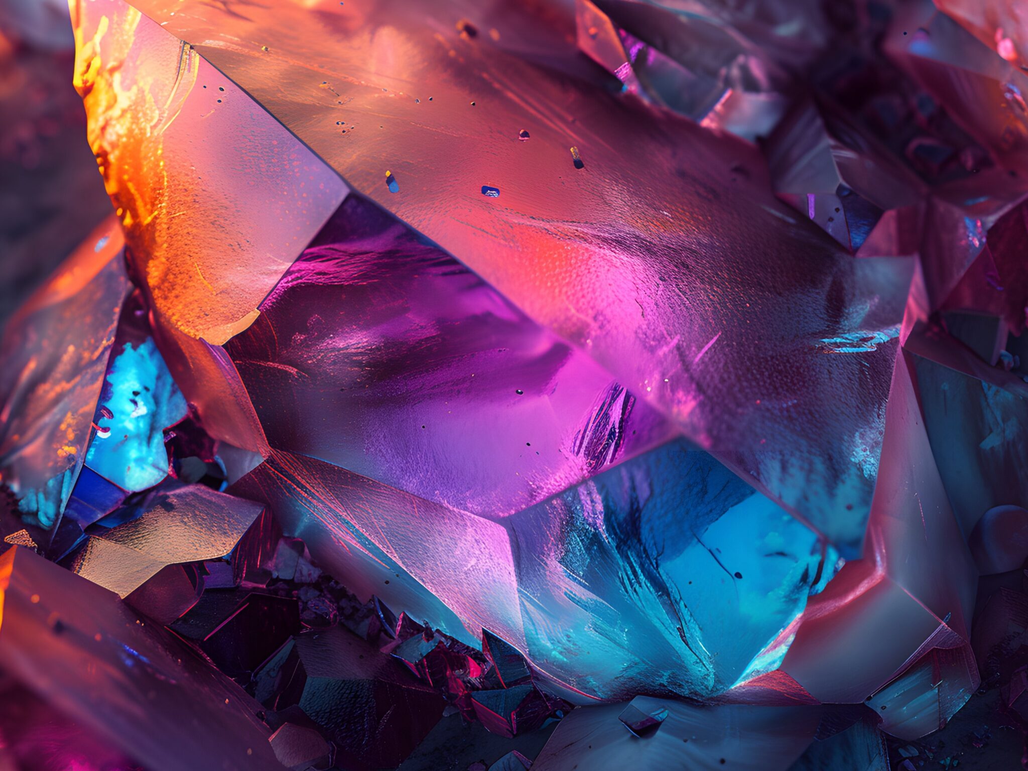Irregular crystal formations fill the frame, tightly packed and overlapping. Light passes through the translucent shapes, creating gradients of pink, blue, and orange.