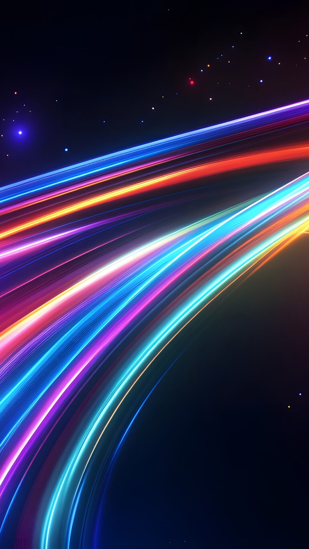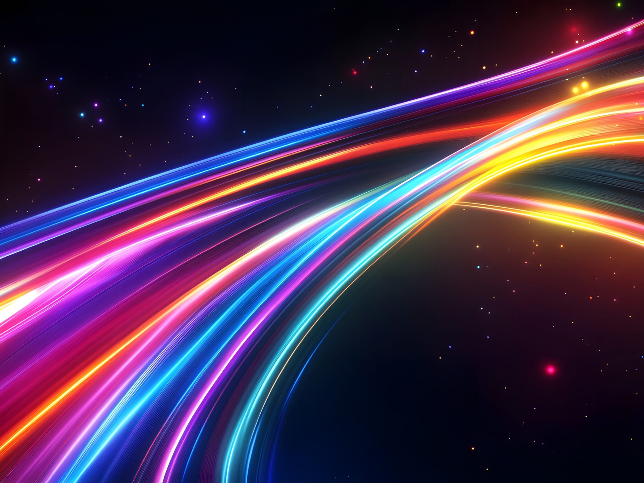 Bright streaks of neon light sweep across a dark background filled with small points of light. The color gradients within the streaks blend …