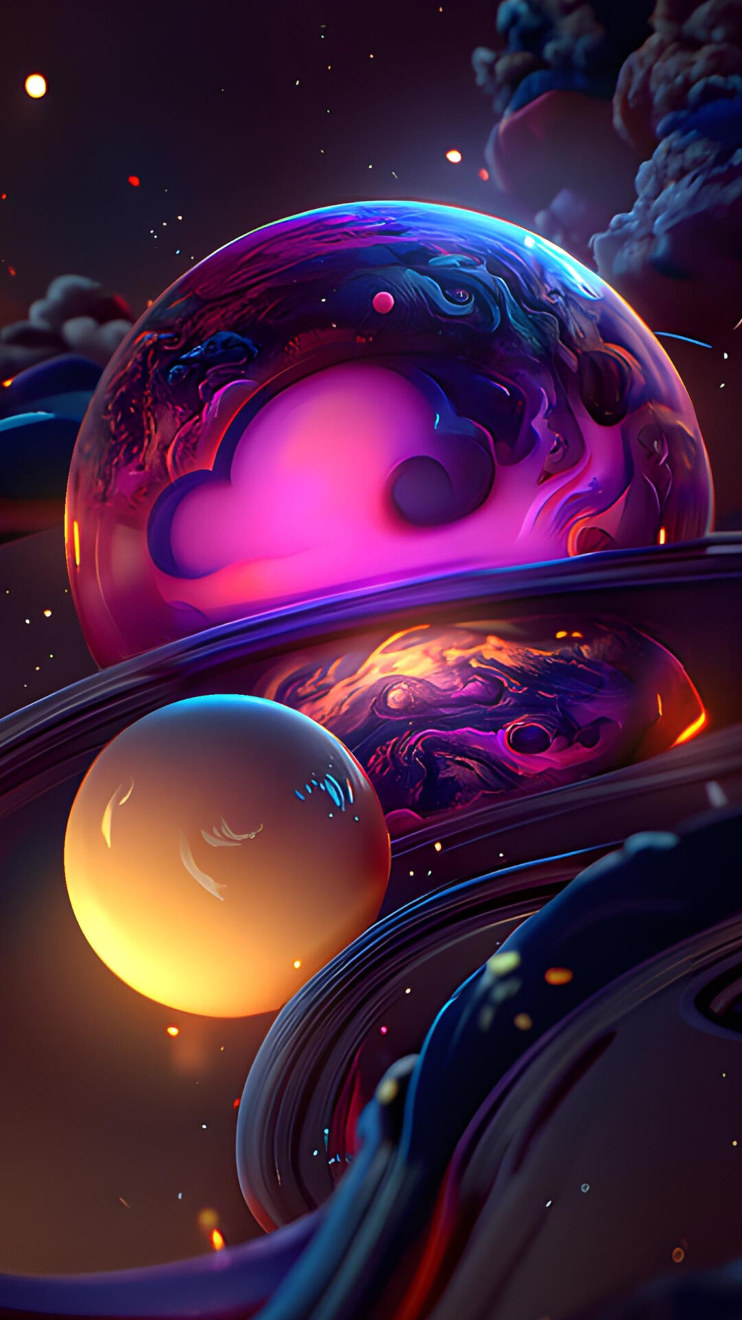 Multiple colorful spheres are arranged within dark, curving frames against a dark background. The composition has a soft, diffused light with streaks and gradients of pink, blue, and orange within each sphere.
