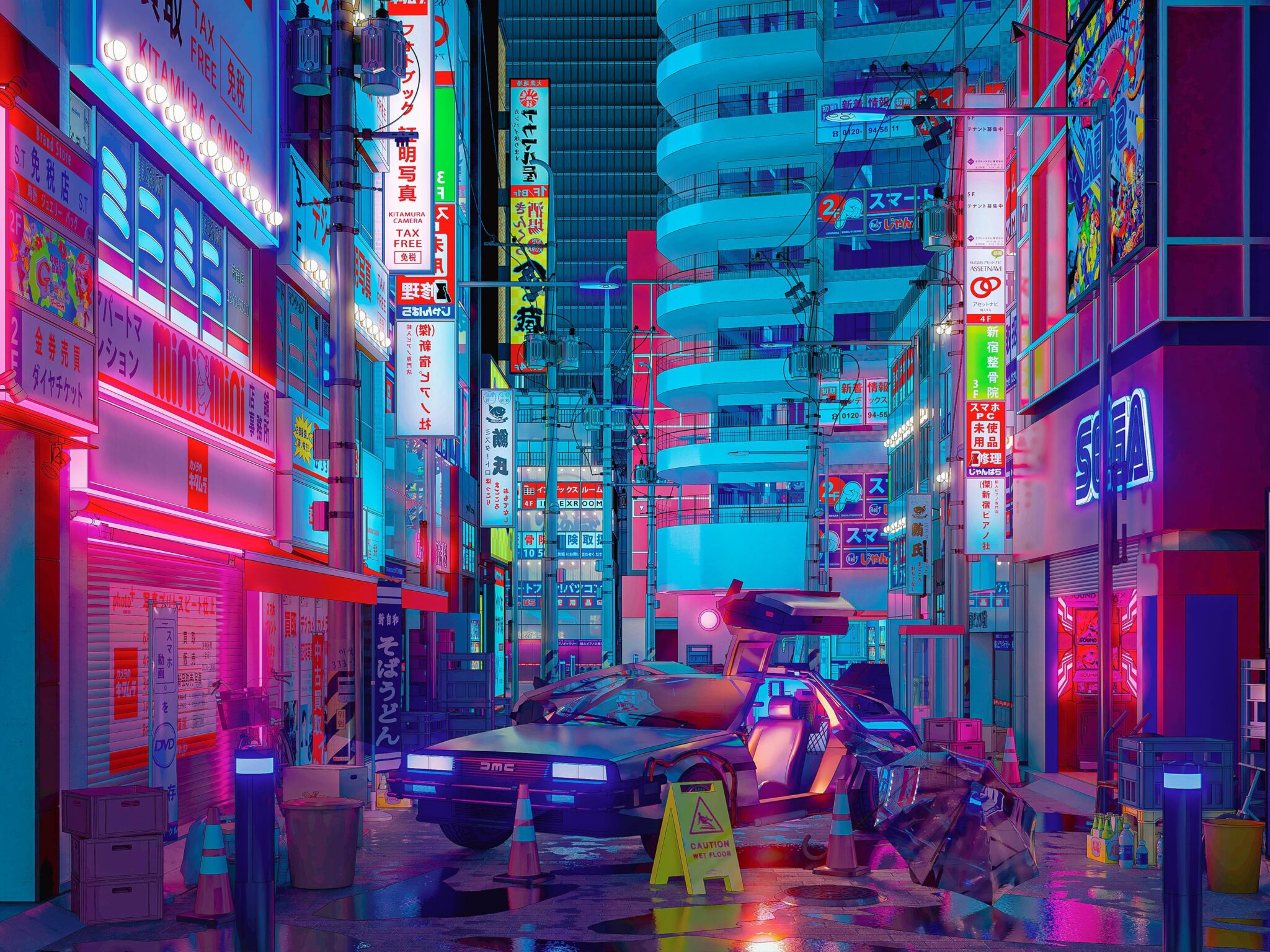 Tokyo's neon nightlife shines bright on a rainy night, a DeLorean parked among the vibrant signs. Moody and cyberpunk, great for a dark desk
