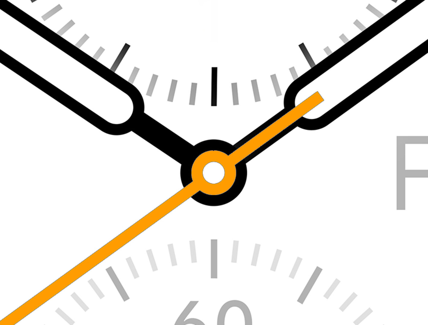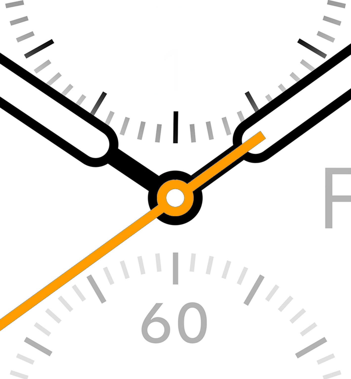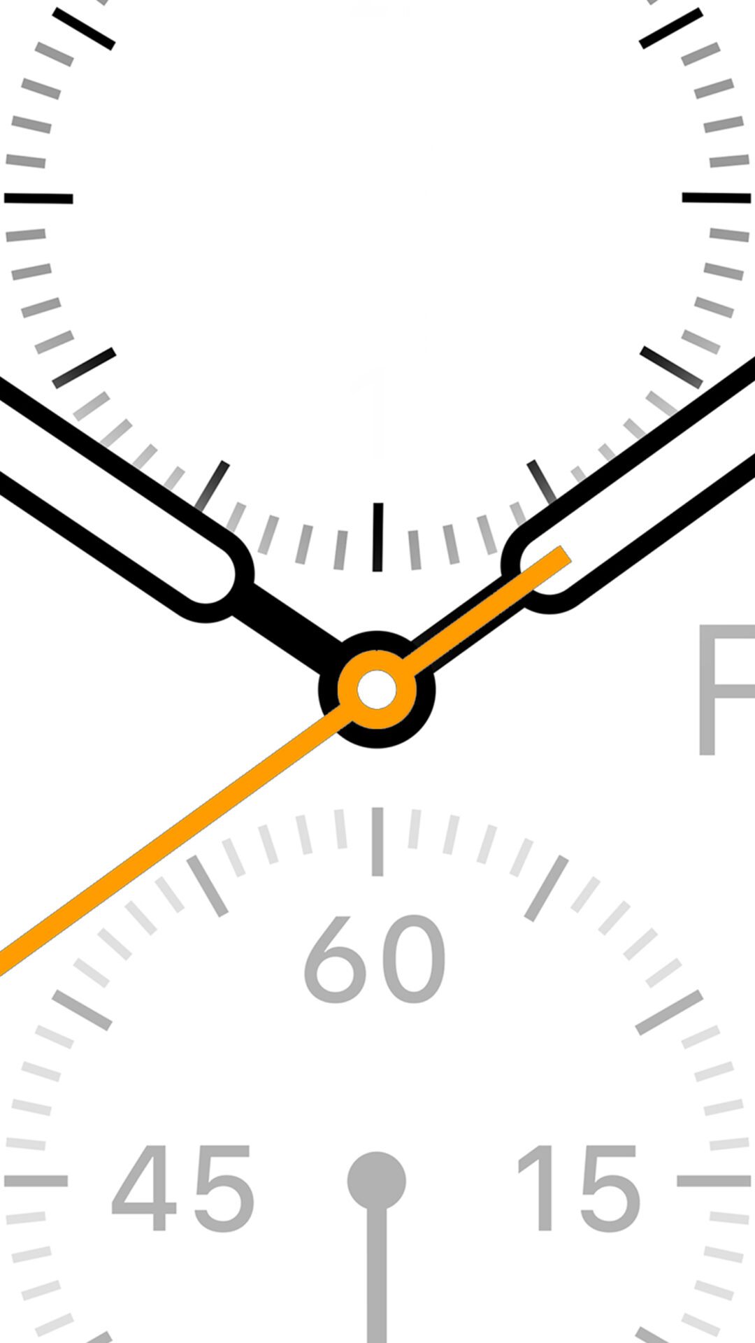 A close-up shows a white clock face with black hands and gray hour markers. The bright orange second hand draws attention to the center, off