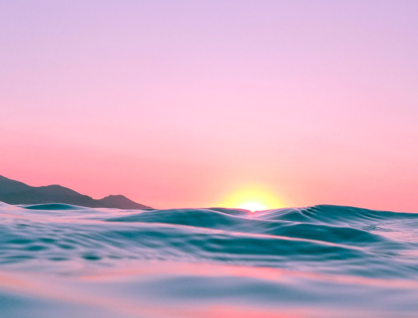 The scene depicts a low horizon line with ocean waves and a sun setting over a distant landmass. Soft pinks and purples blend into a light blue sky, reflected in the gentle texture of the water.