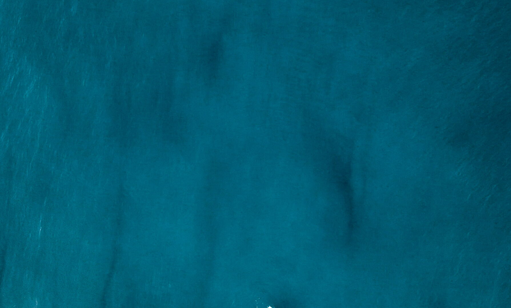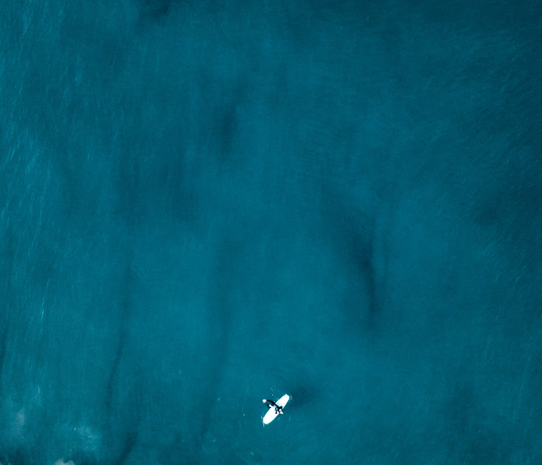 An aerial view shows a surfboard floating on deep blue ocean water near a foamy shoreline. Light highlights the textured surface of the waves, creating a strong contrast with the darker water depths.