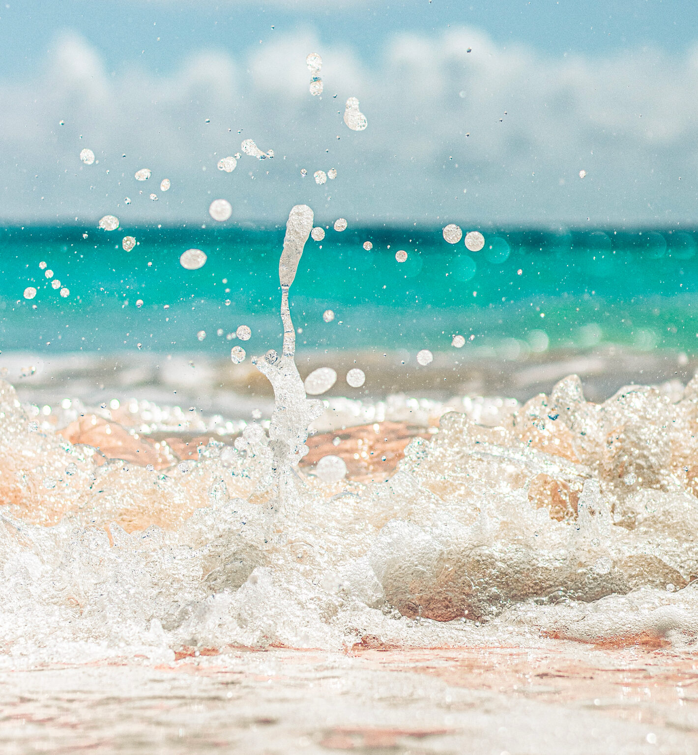 A wave breaks on a sandy beach under a light blue sky with scattered clouds. The foamy water is captured mid-splash, creating a blurred text