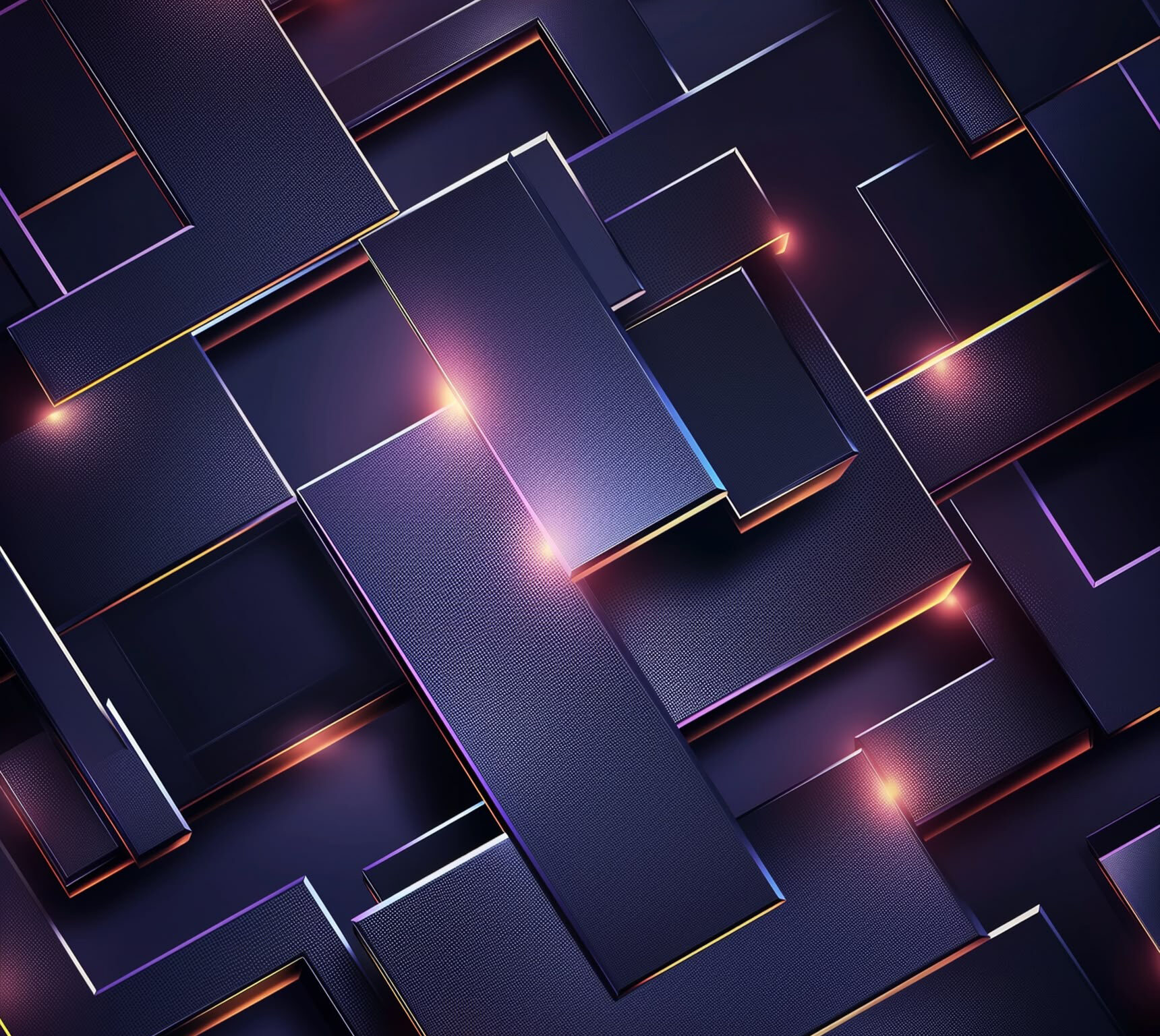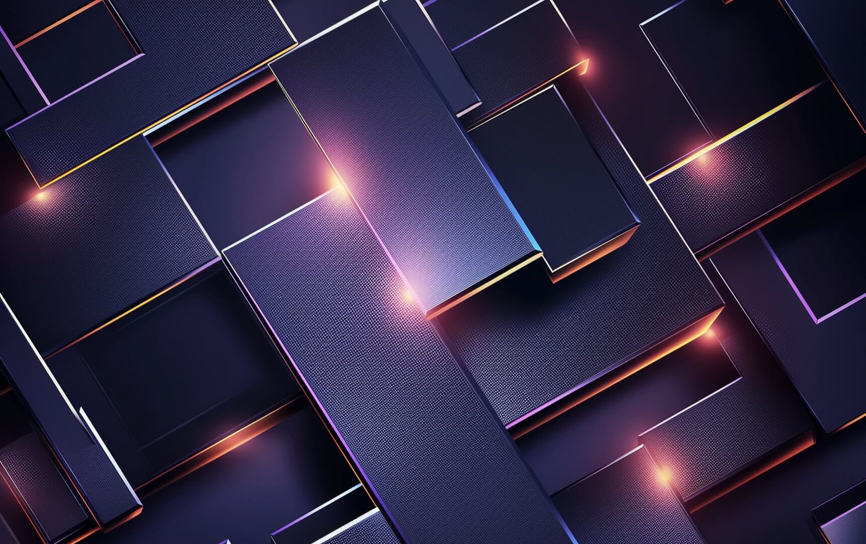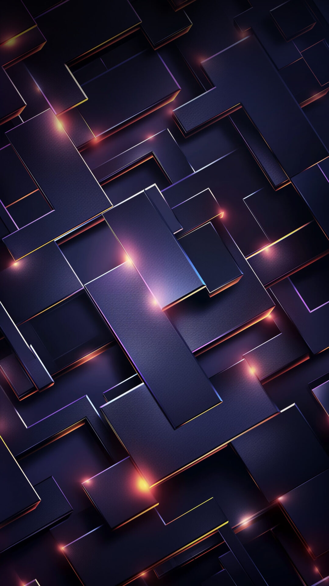 Dark purple and black rectangular blocks create a layered, geometric pattern across the composition. Thin orange lines accent the edges and intersections of the shapes, giving a sense of depth and subtle illumination.