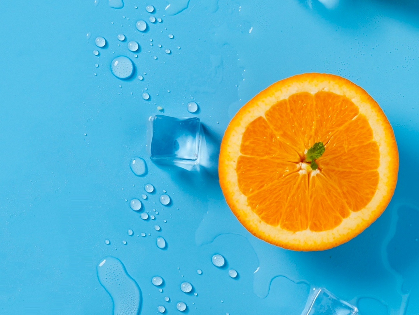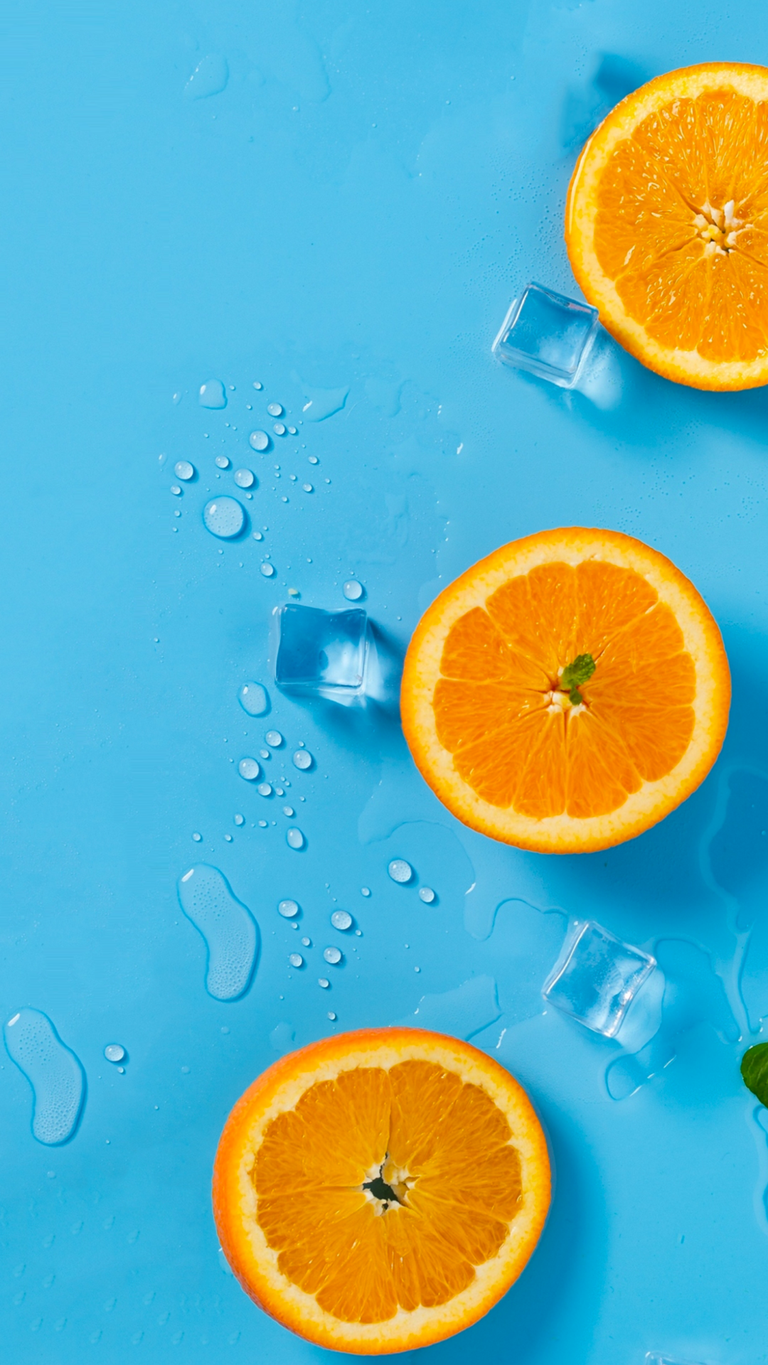 Three orange halves and several ice cubes are arranged on a blue surface. Water droplets create a slick texture and subtle highlights across the composition.