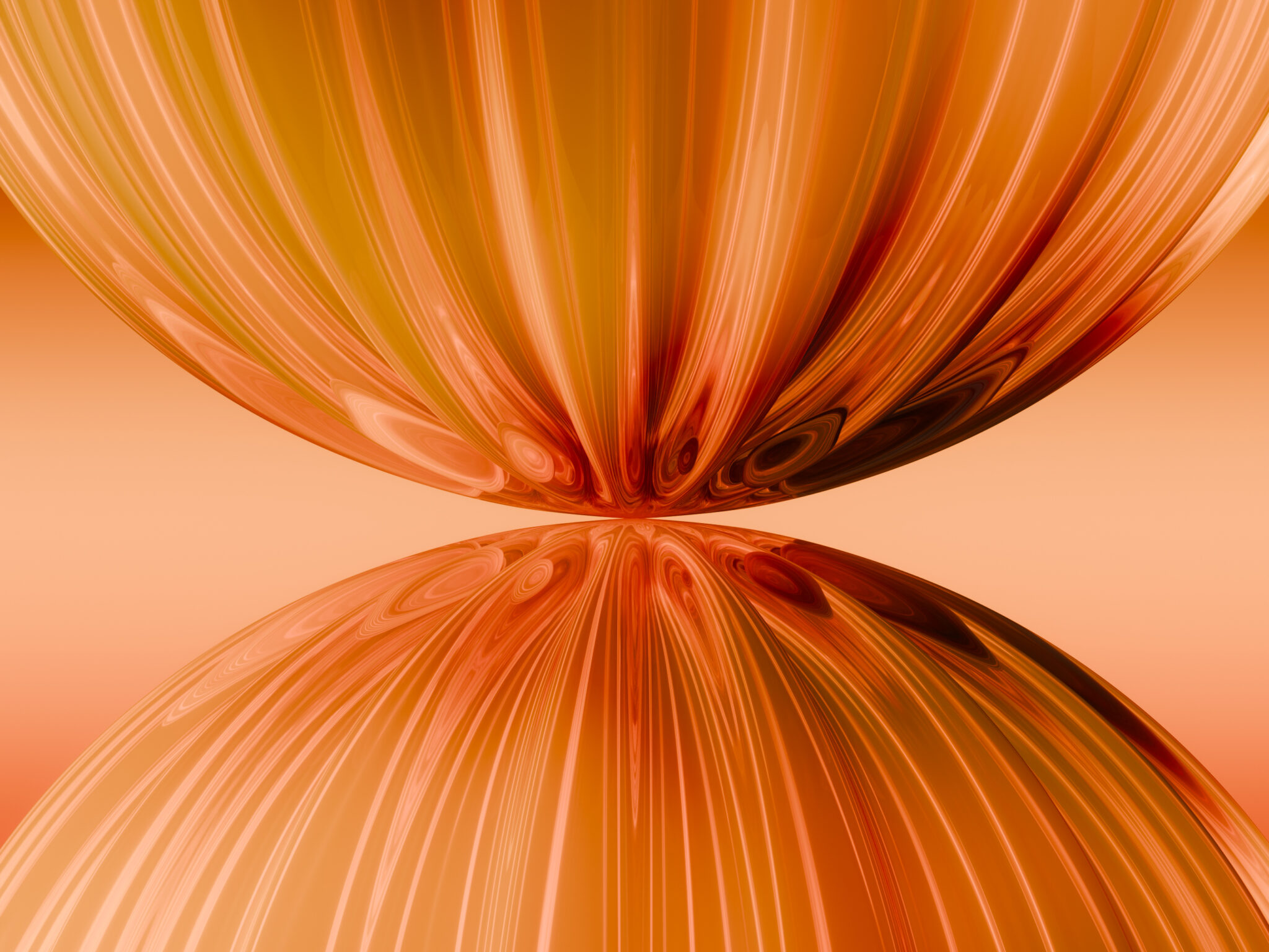 Two rounded forms fill the frame, appearing to nearly touch at their centers. Warm orange and reddish-brown hues blend across their surfaces