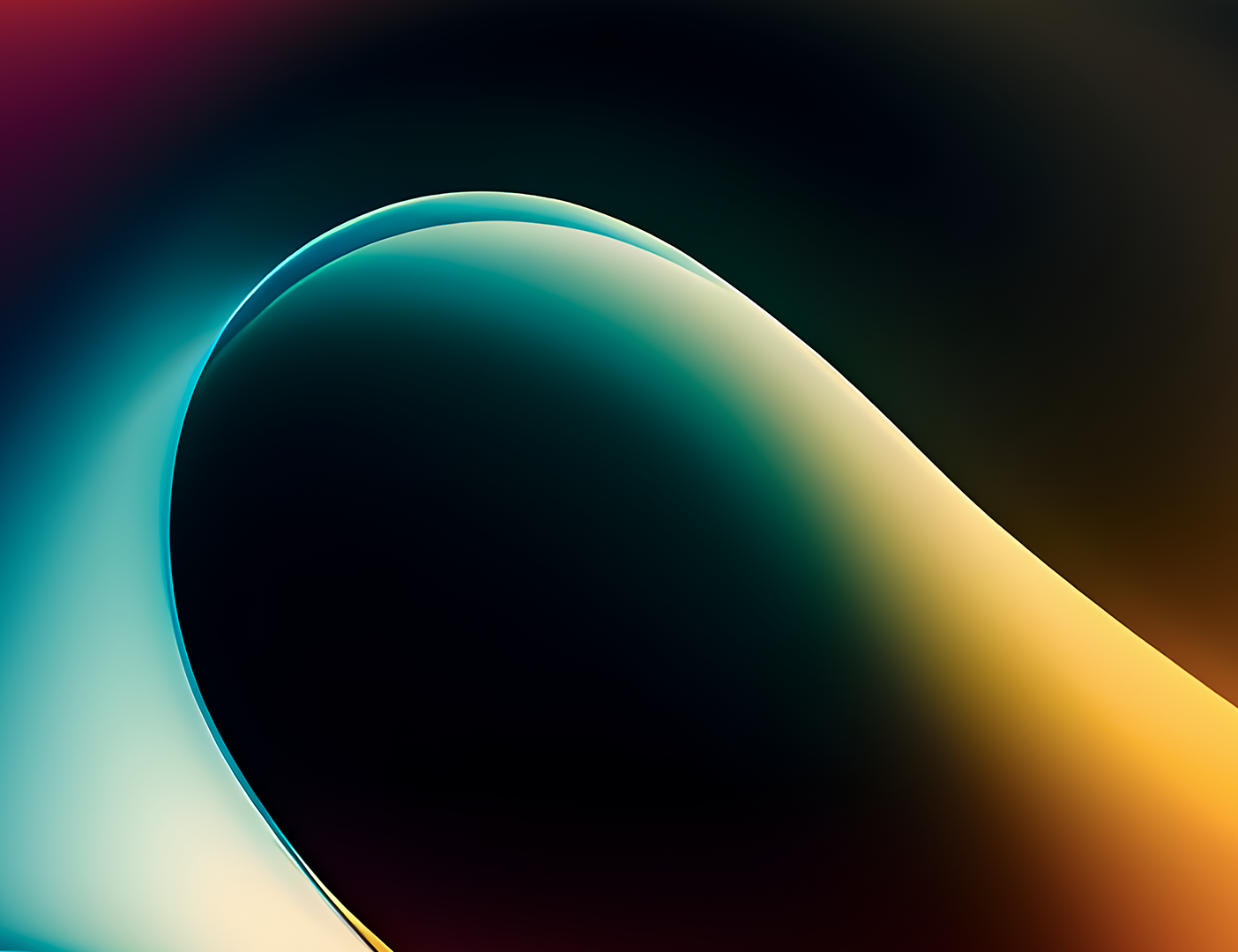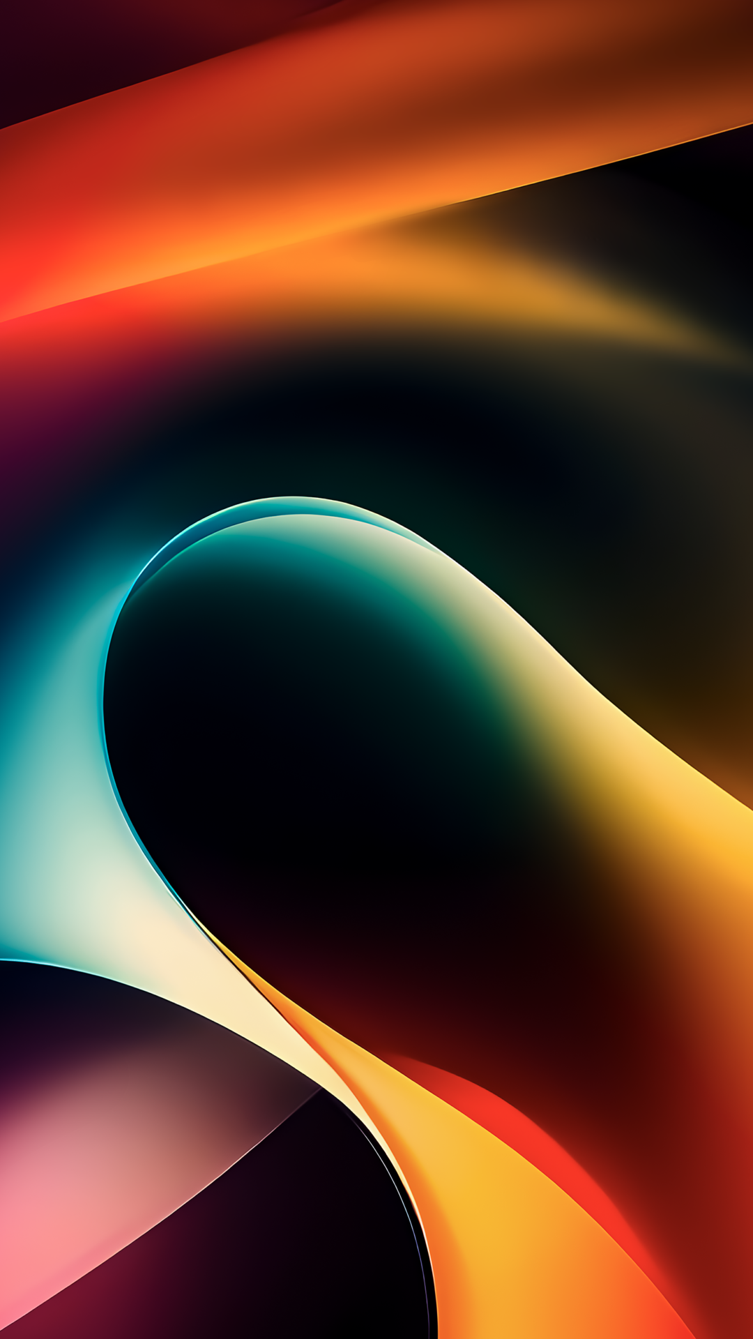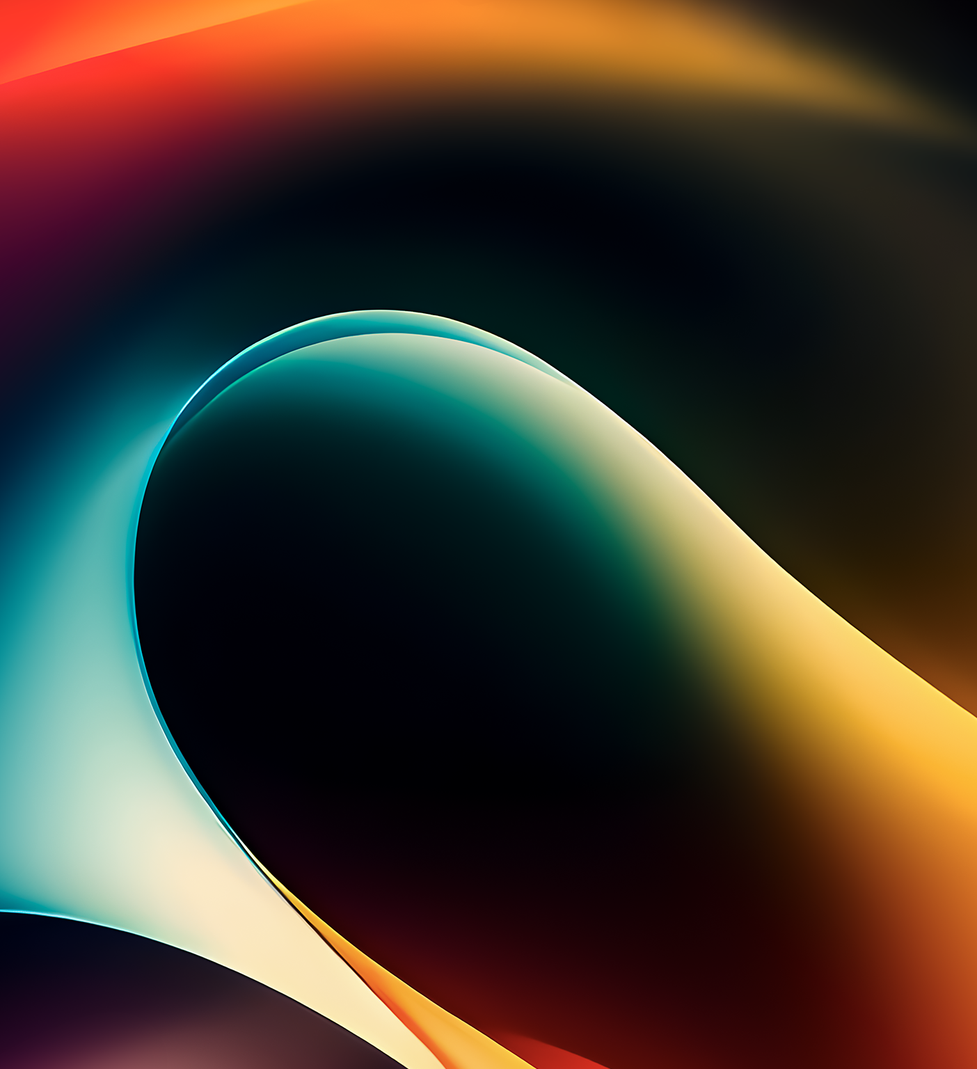 Flowing abstract shapes fill the frame, layered in darkness. Soft gradients blend orange, teal, and yellow with a smooth, glossy texture.
