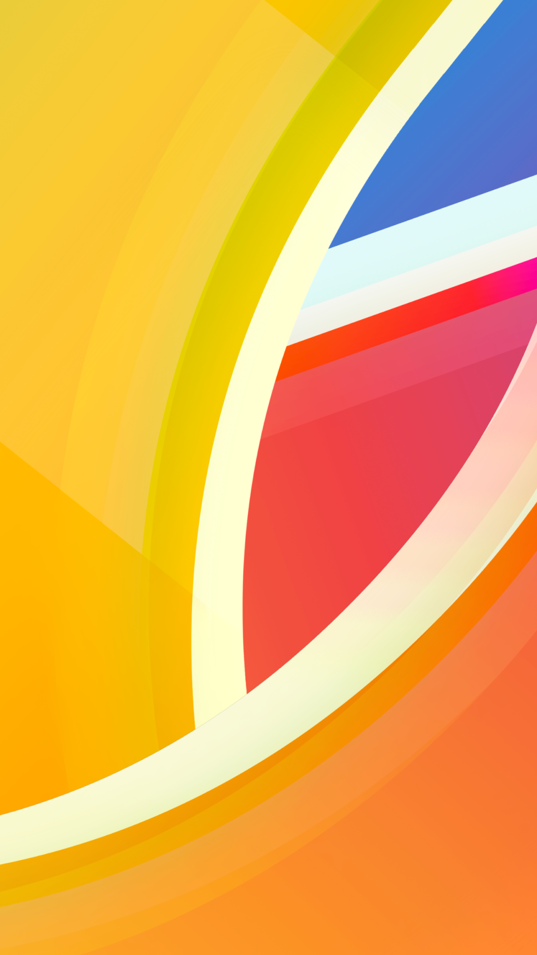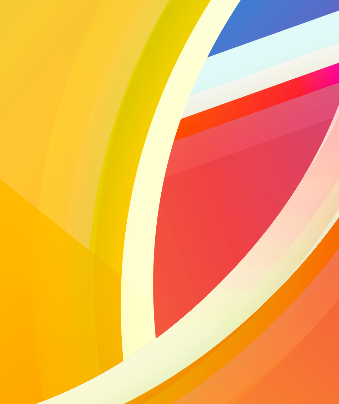 Overlapping curved shapes fill the composition with bright, solid colors. A gradient of orange and yellow provides depth to the lower porti
