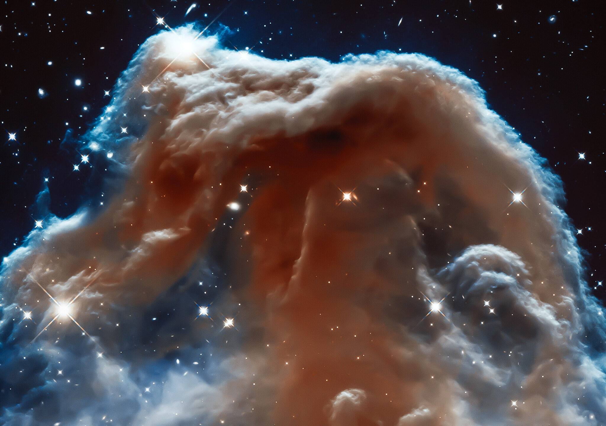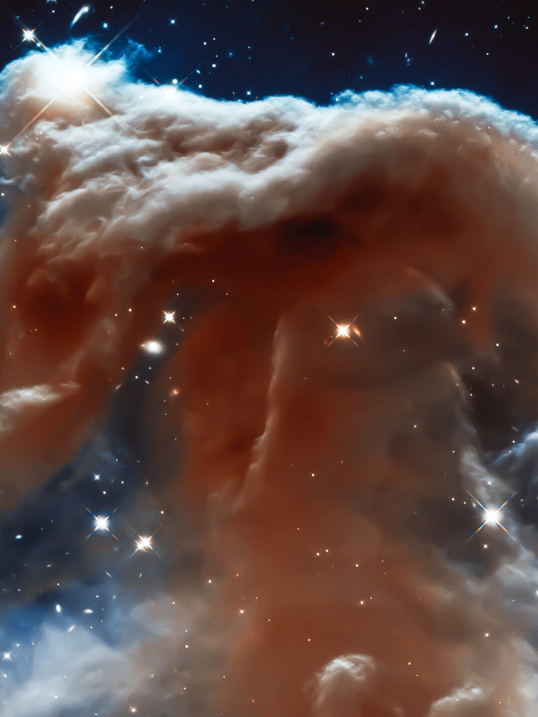 Billowing clouds of orange and electric blue gas swirl around scattered white stars in this digitally enhanced nebula render. A radiant ligh