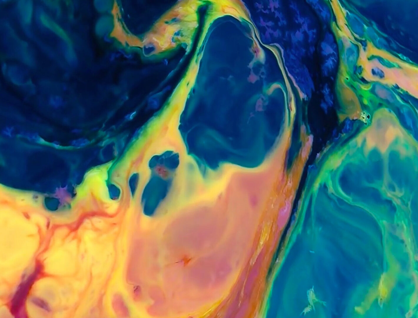 Fluid acrylics blend into a swirling composition, filling the frame. Layers of blue, yellow, and green create a textured, marbled effect with depth.