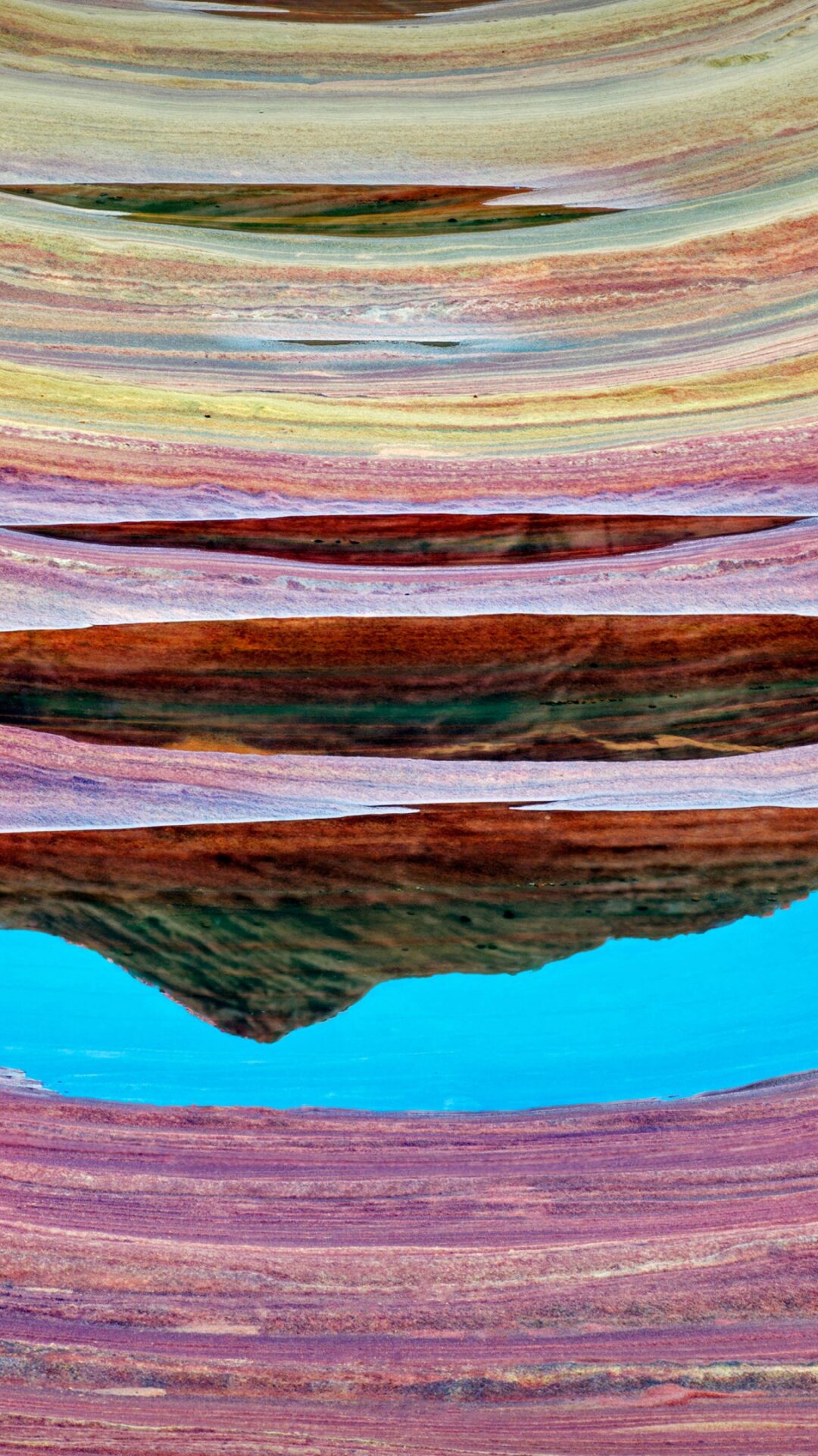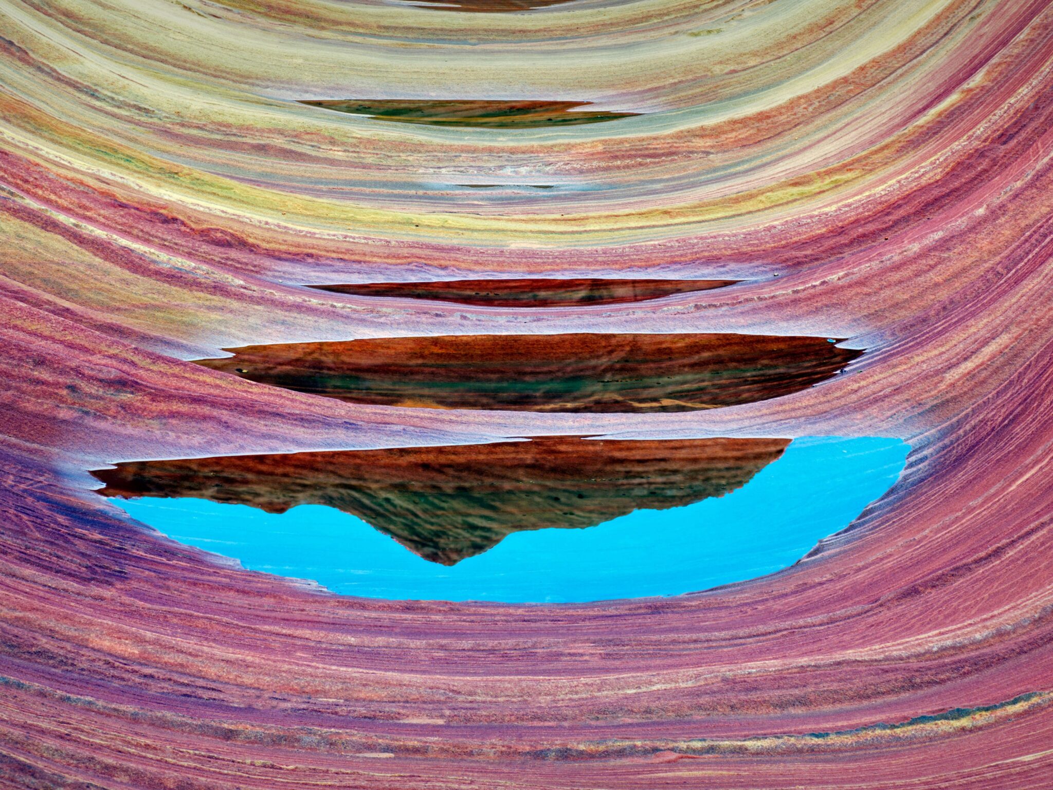 Swirling sandstone layers in rose pink, cream, and dusty purple curve around still pools reflecting the Arizona sky at The Wave formation in…