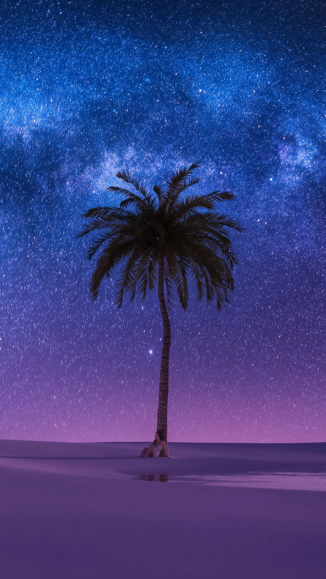 A palm tree stands silhouetted on a beach beneath a star-filled night sky. The composition uses deep blues and purples, with a soft reflecti…