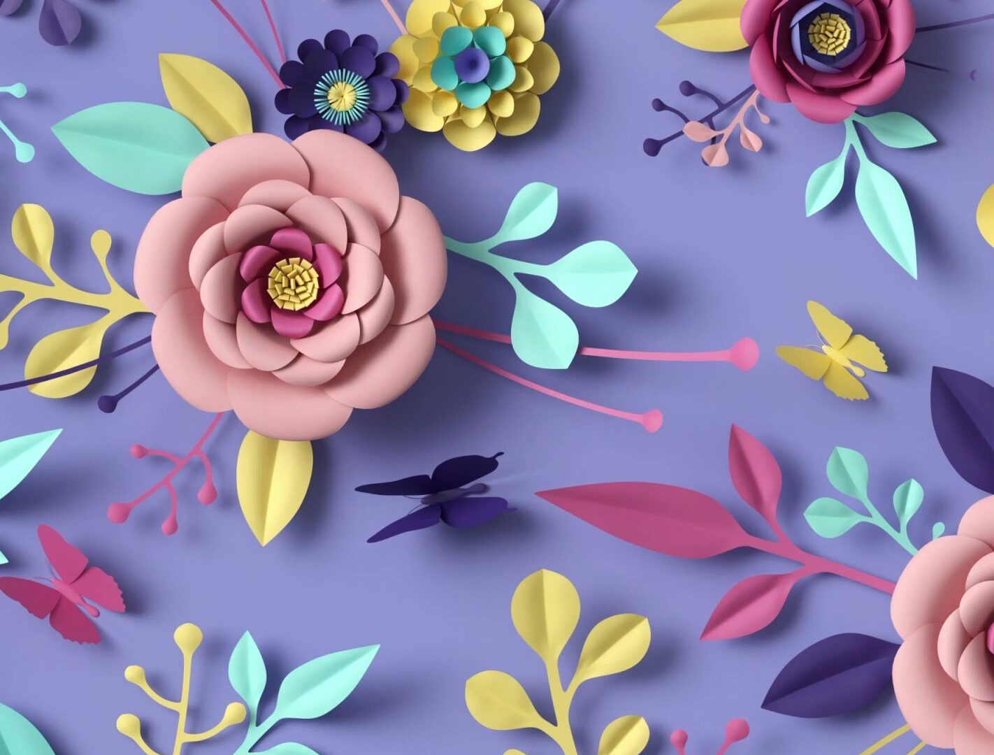 Layers of colorful paper flowers and leaves fill the frame in a repeating arrangement. The textures create soft shadows and a sense of depth against the lilac background.