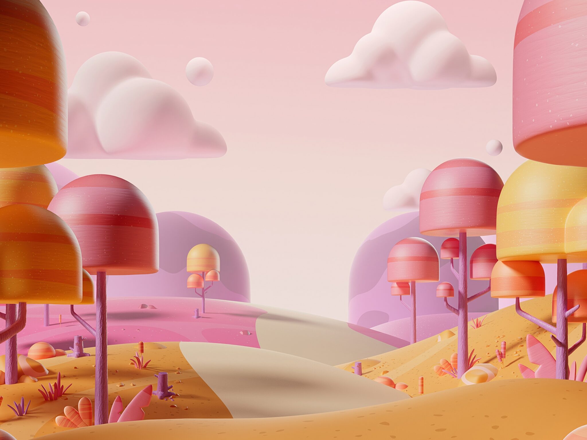 A digital landscape displays numerous rounded, mushroom-like trees along a gently curving path. Soft pastel pinks and oranges create a warm,…