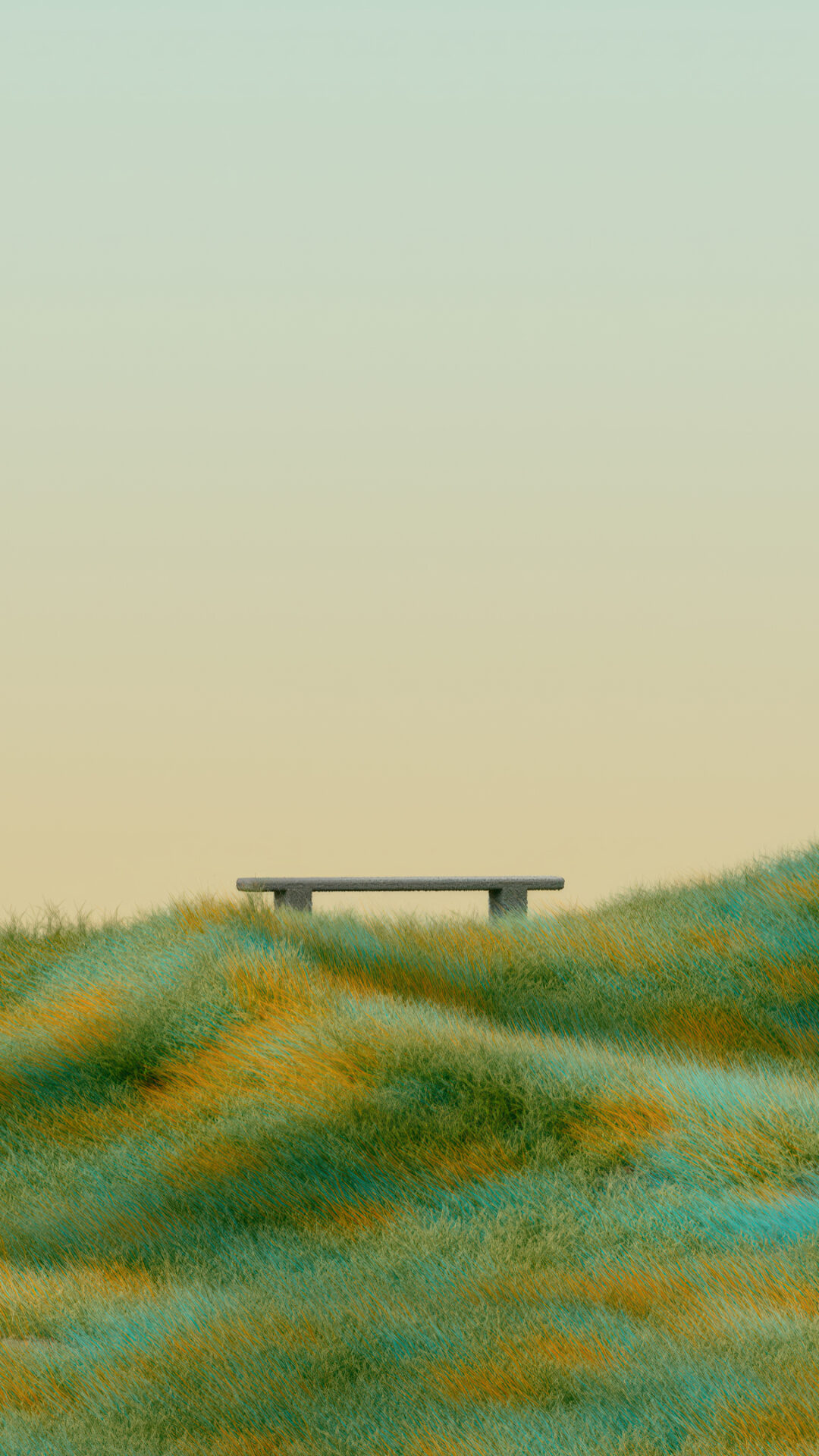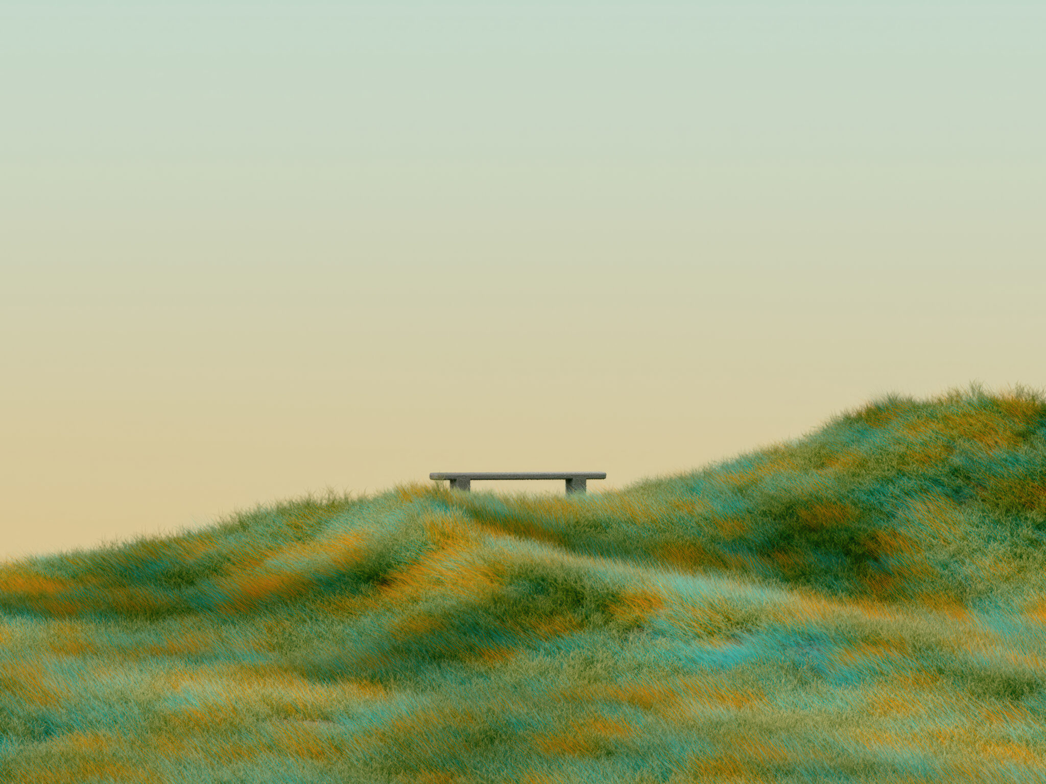 Rolling green hills dotted with golden patches stretch beneath a soft peachy sky, with a simple wooden bench perched on the crest. Clean min