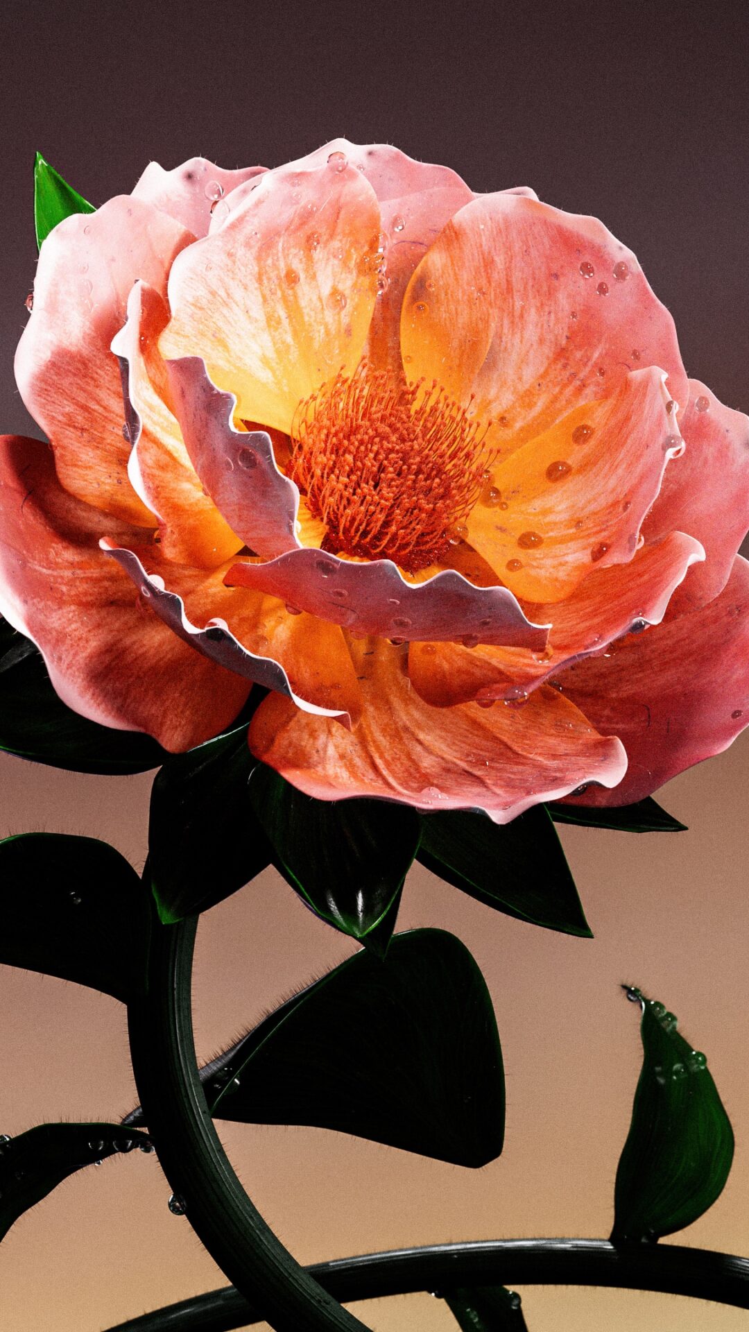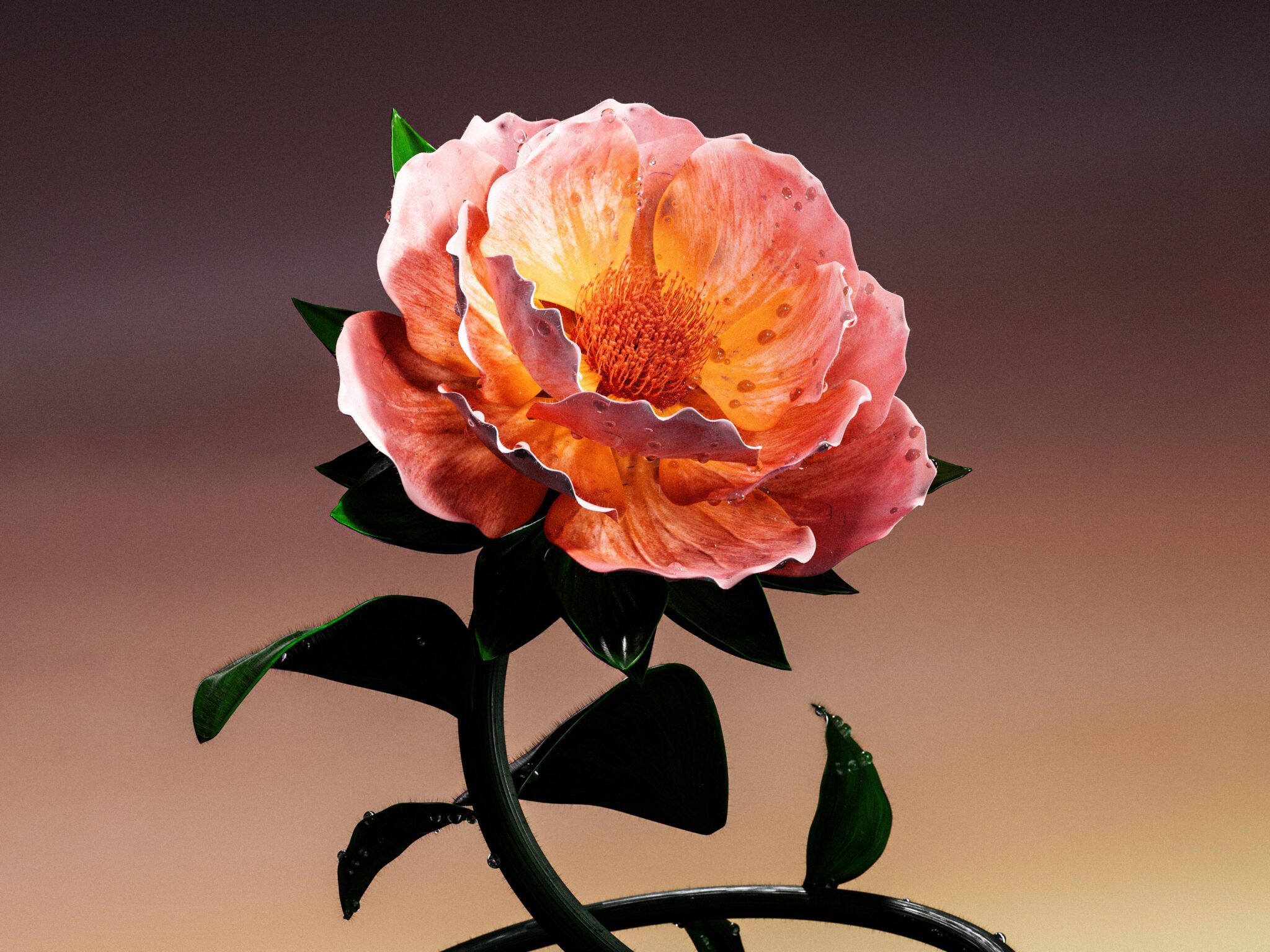 A single peach-colored flower is centered against a blurred, warm gradient background. The petals have a slightly ruffled texture and catch …