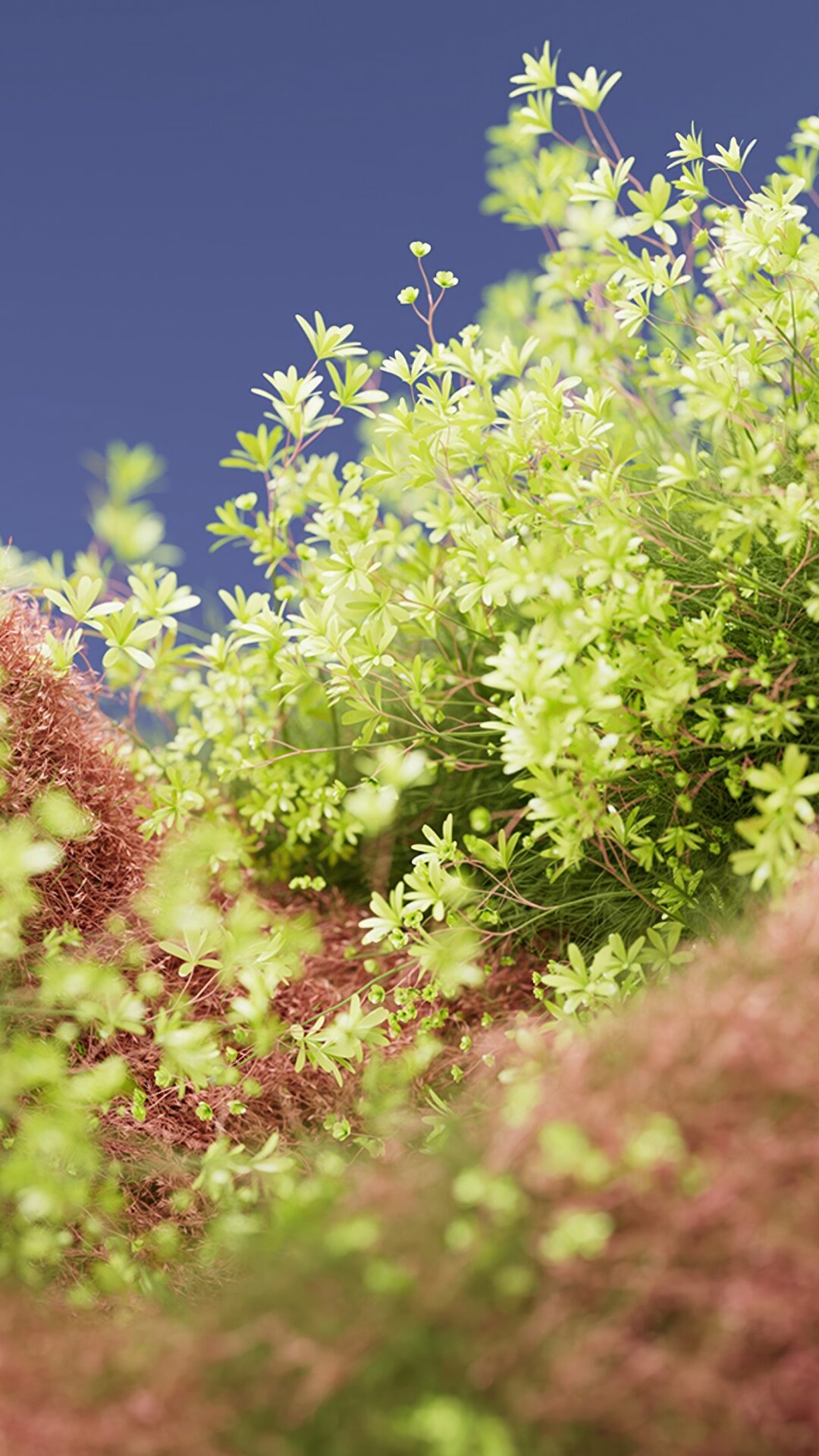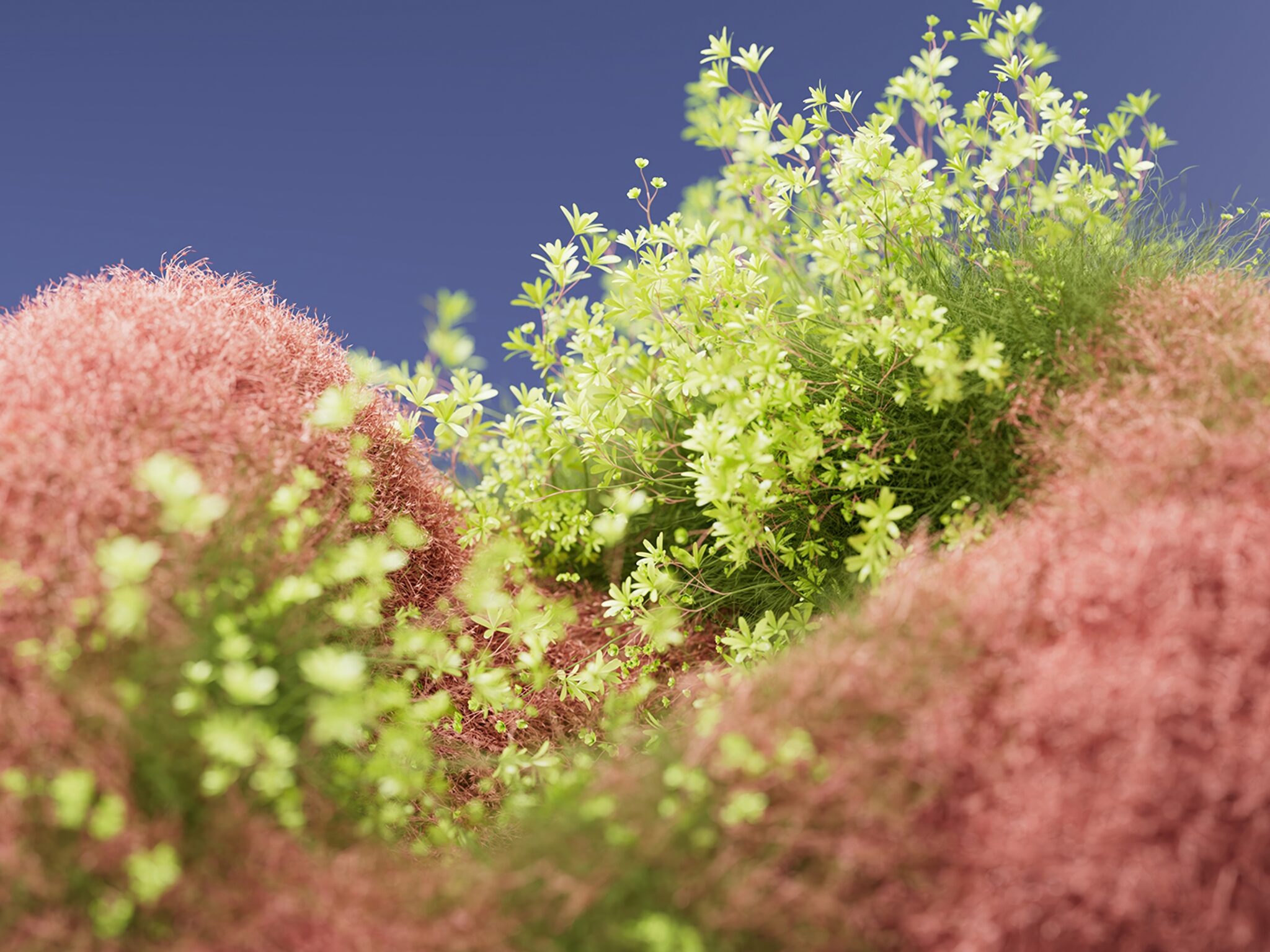 Soft peachy-pink fuzzy blooms mix with delicate lime green foliage against a muted blue background, creating a dreamy botanical close-up wit