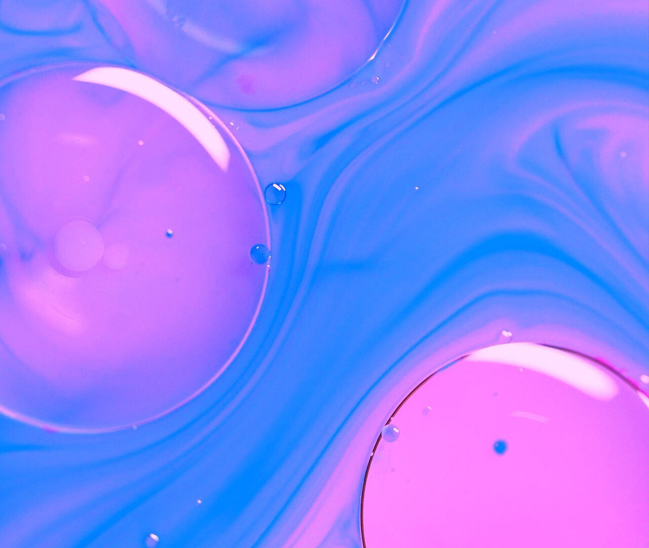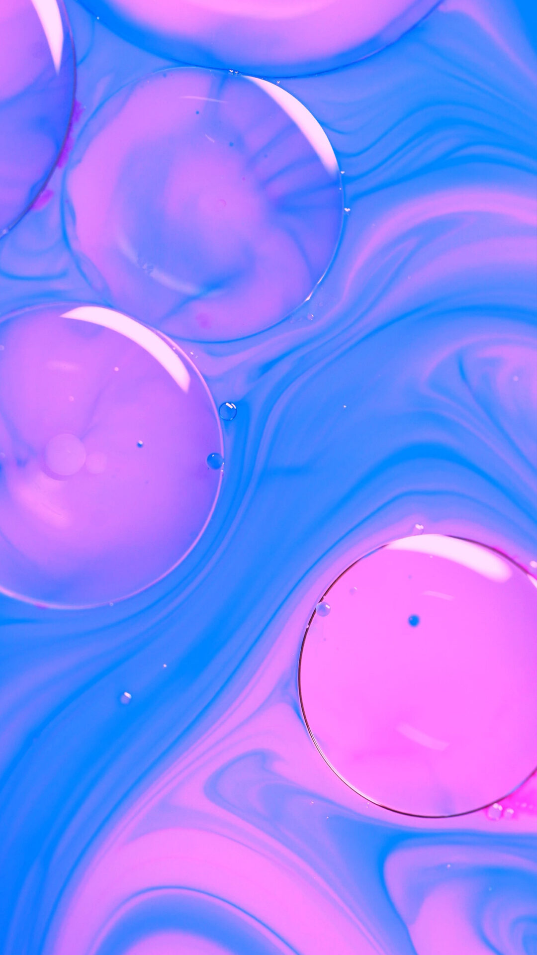 Abstract circles of pink and blue float on a swirling liquid surface. The glossy textures create a sense of depth with light reflecting off