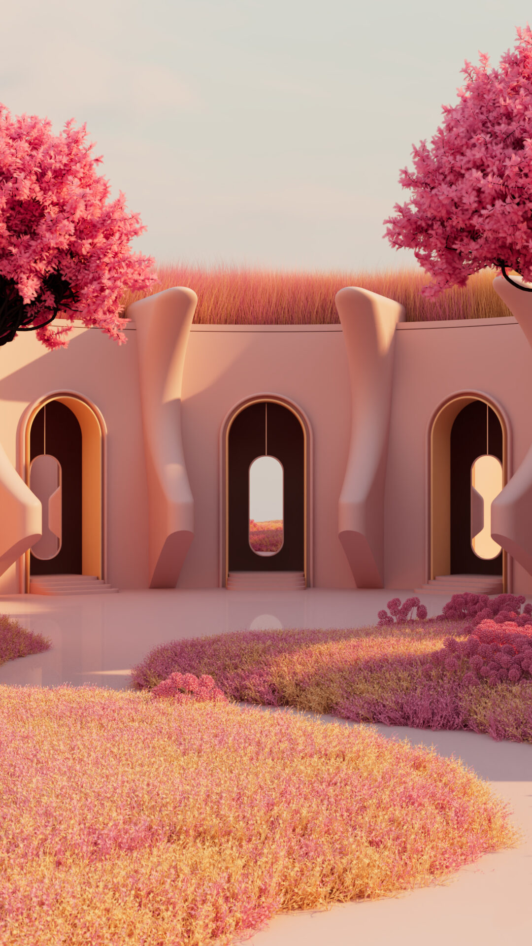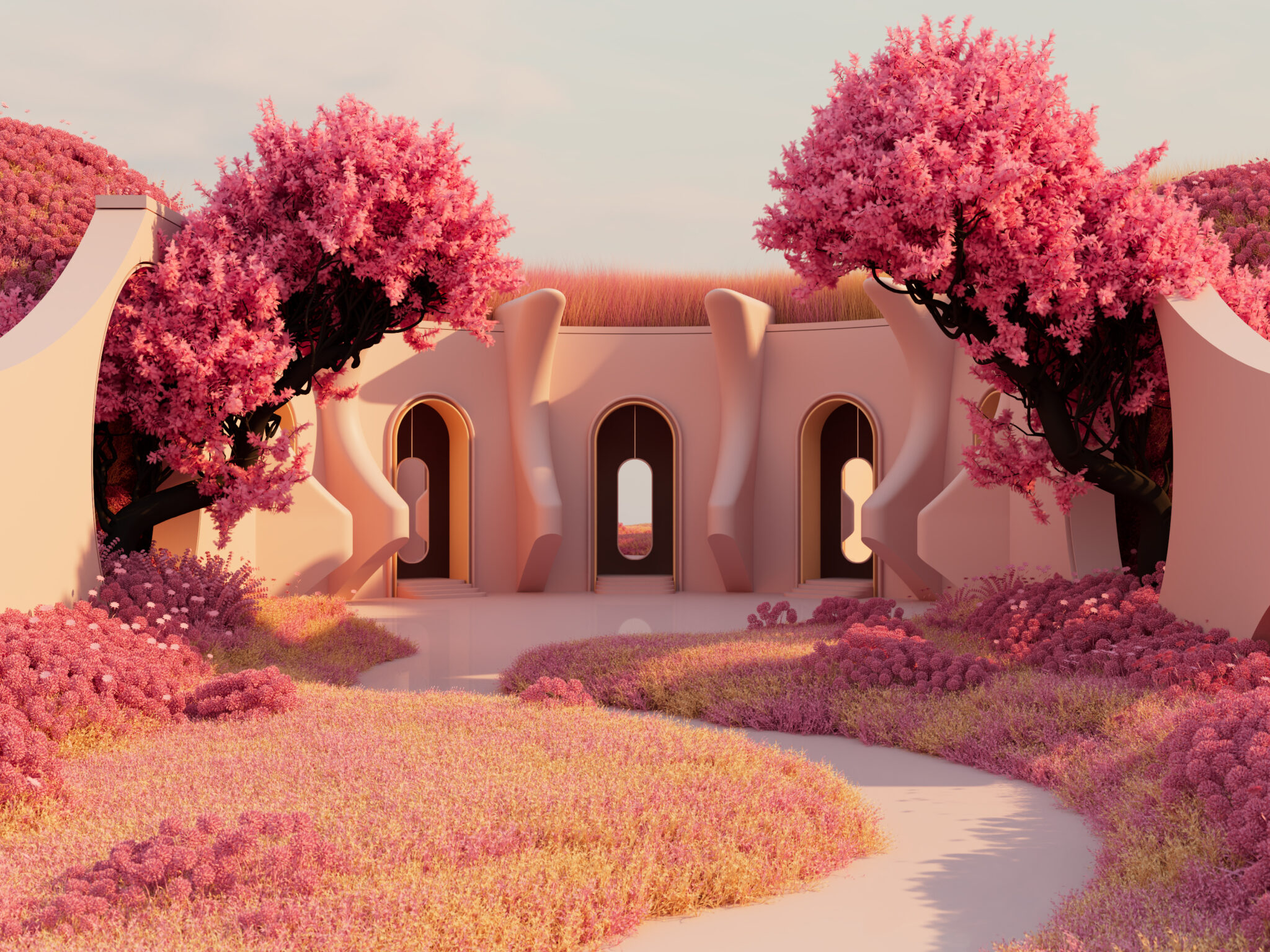 A light pink building with arched doorways rests within a landscape of rolling pink hills and flowering plants. The soft, diffused light creates a gentle warmth across the rounded forms and the winding path leading to the entrance.