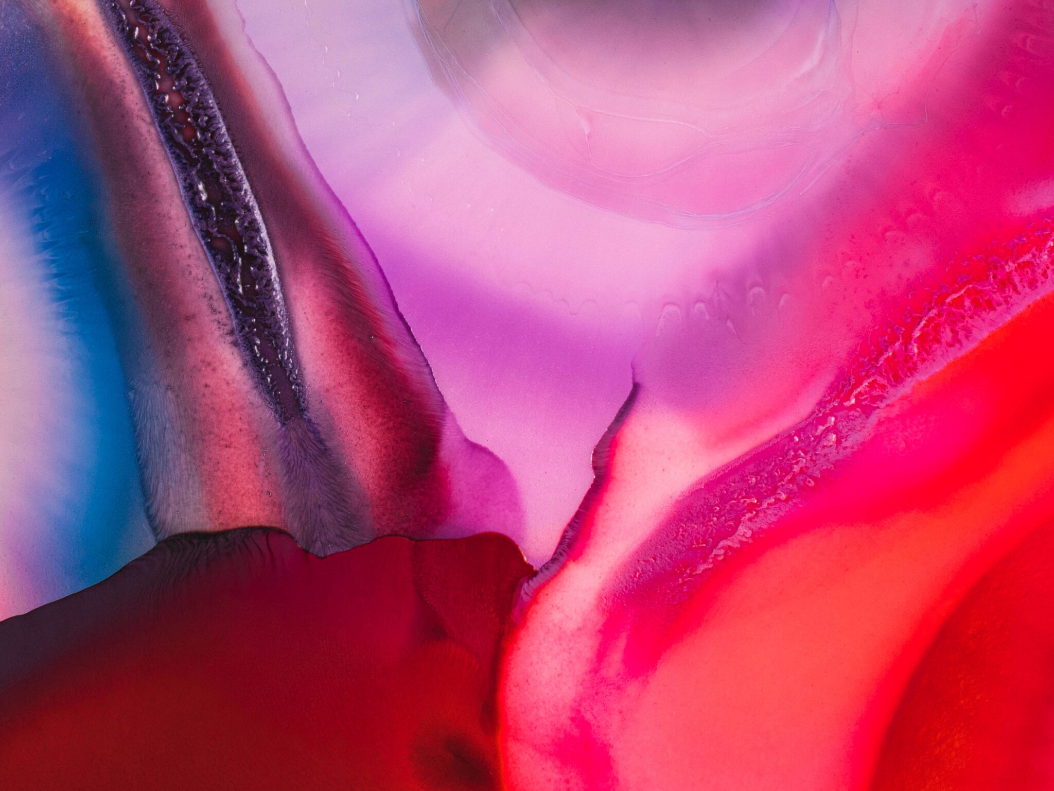 Swirling fluid art with rich magenta, deep red, soft pink, and touches of cyan blue bleeding into each other like ink in water. For 4K monit…