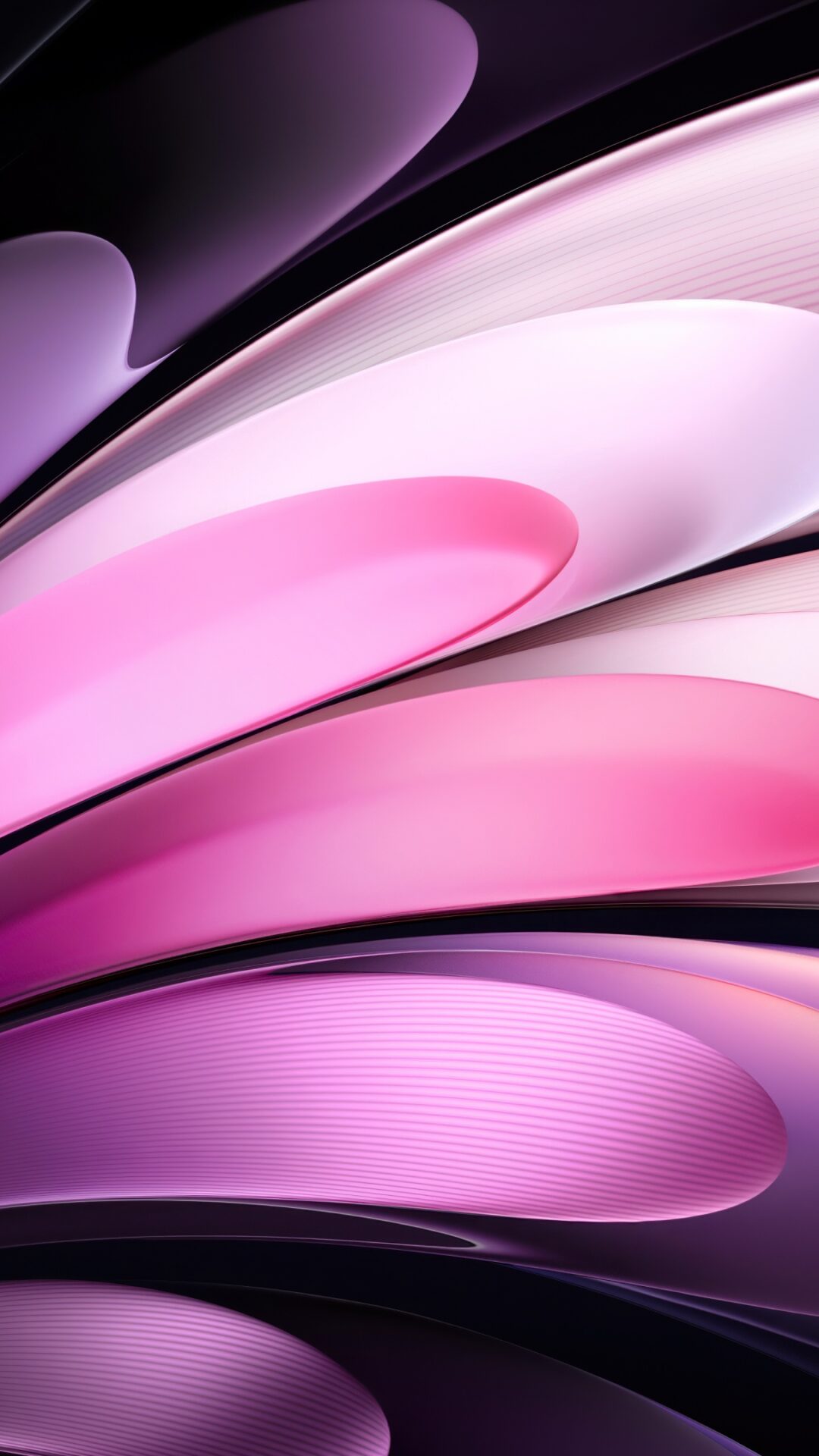 Overlapping curved shapes fill the frame, shifting from deep purple to pale pink. A glossy texture and subtle light reflections create a sen…