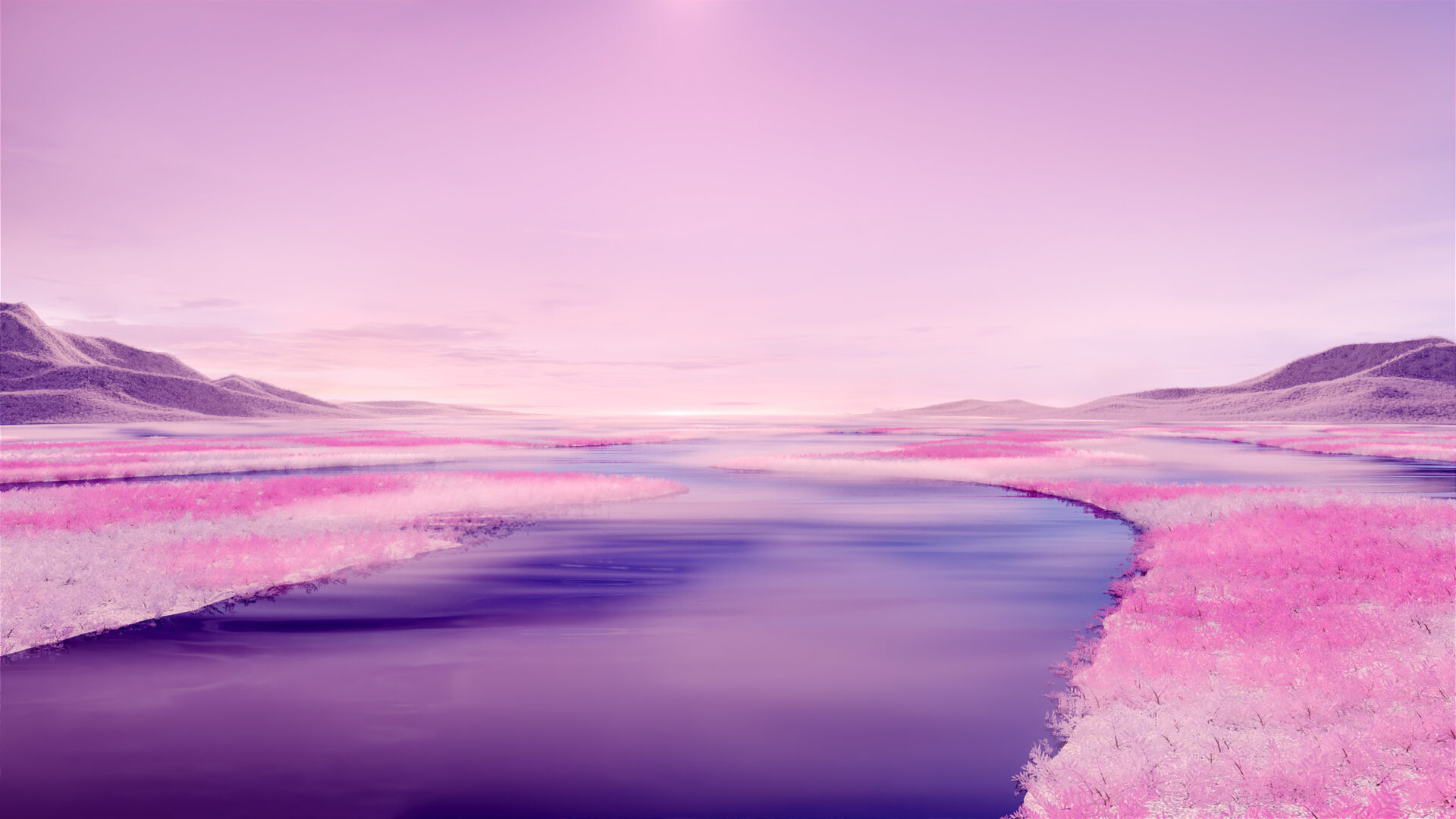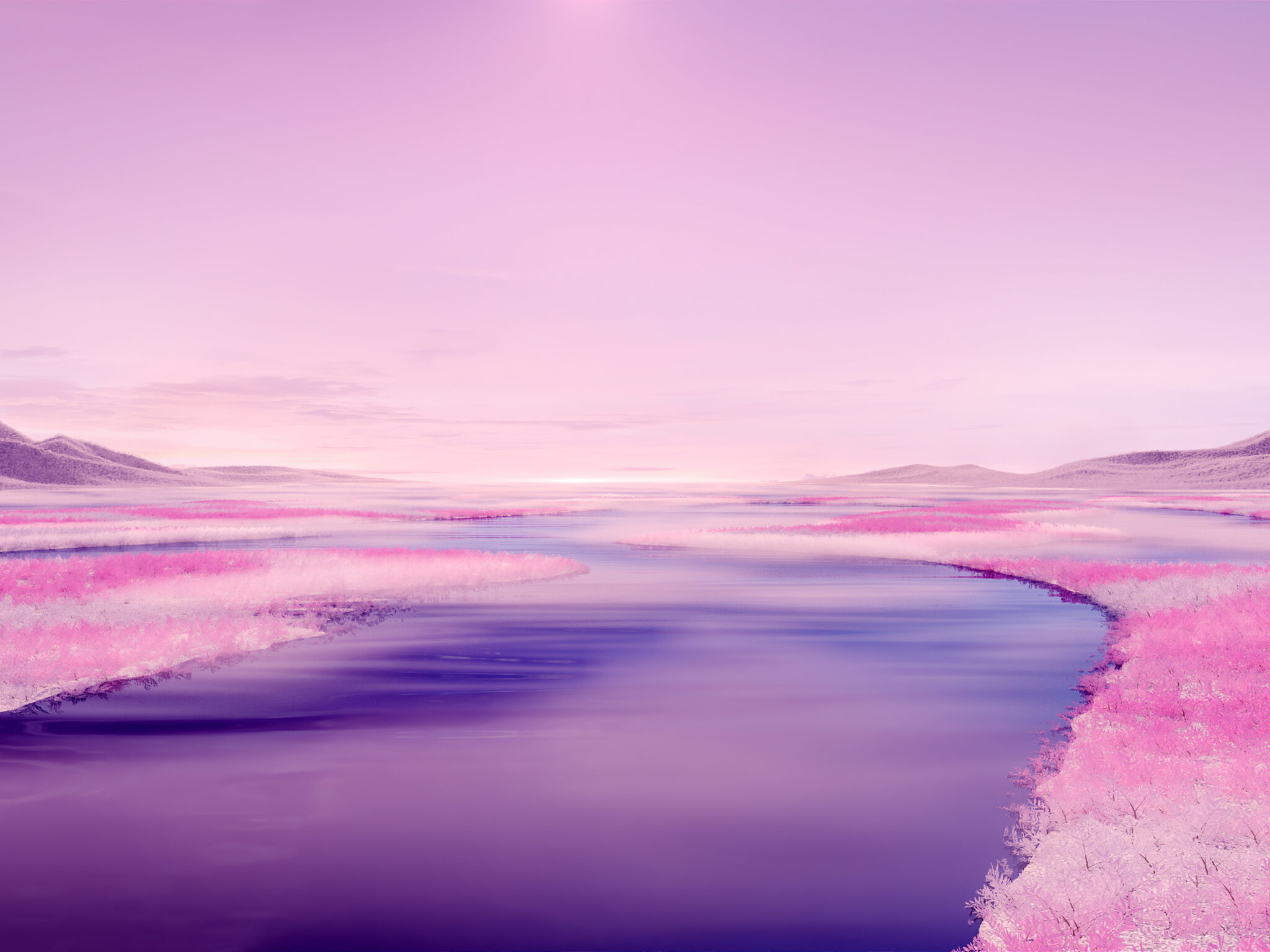 Purple river winds through pink dreamscape