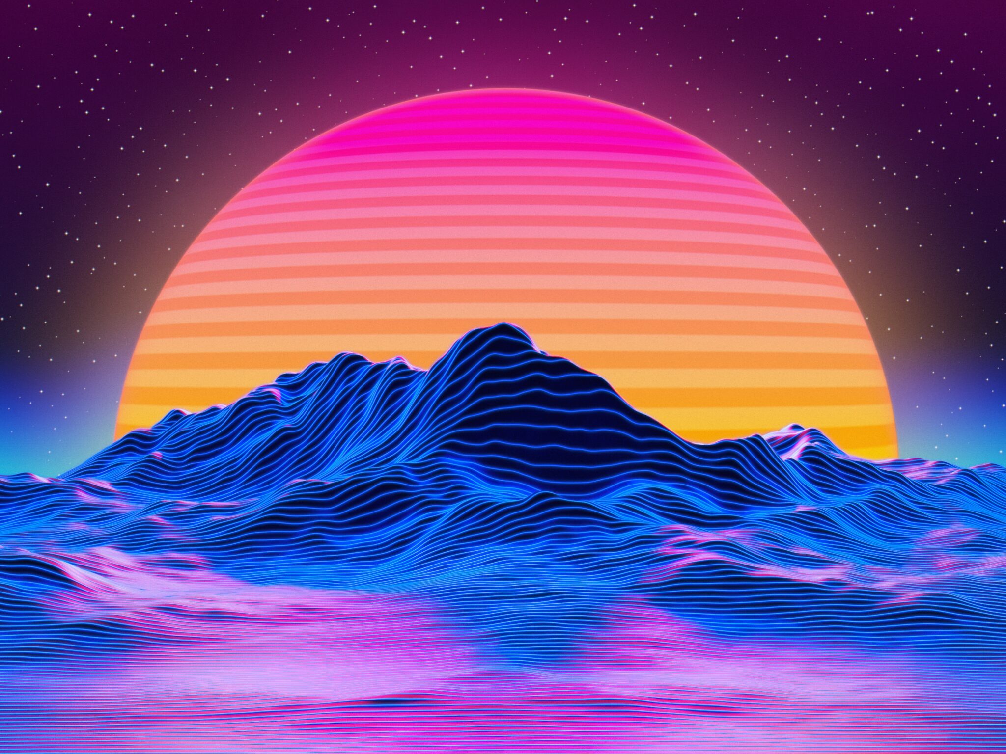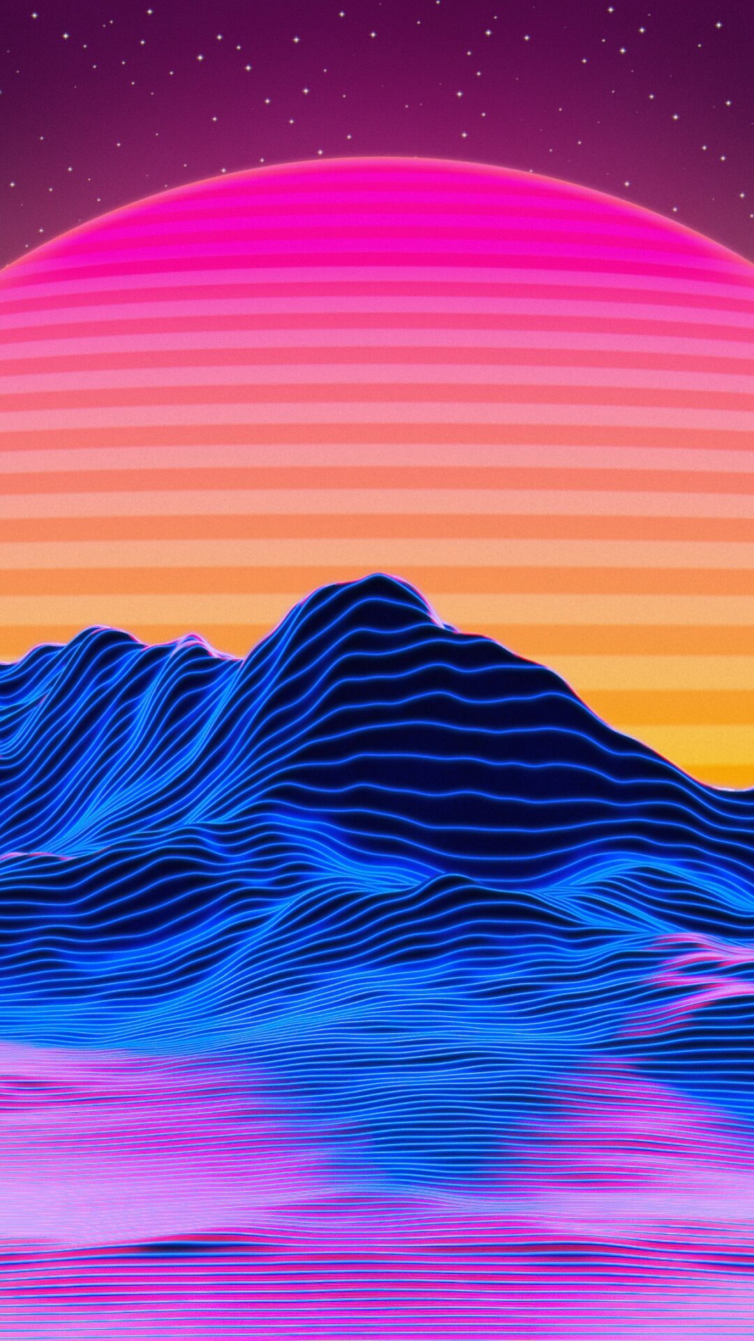 A landscape of layered waves rises toward a large, circular sunset. The scene is rendered with bright neon colors and a grid-like texture, c