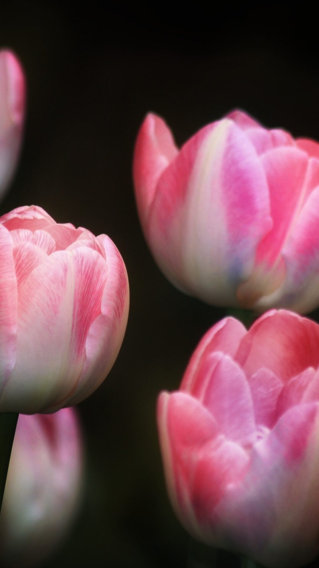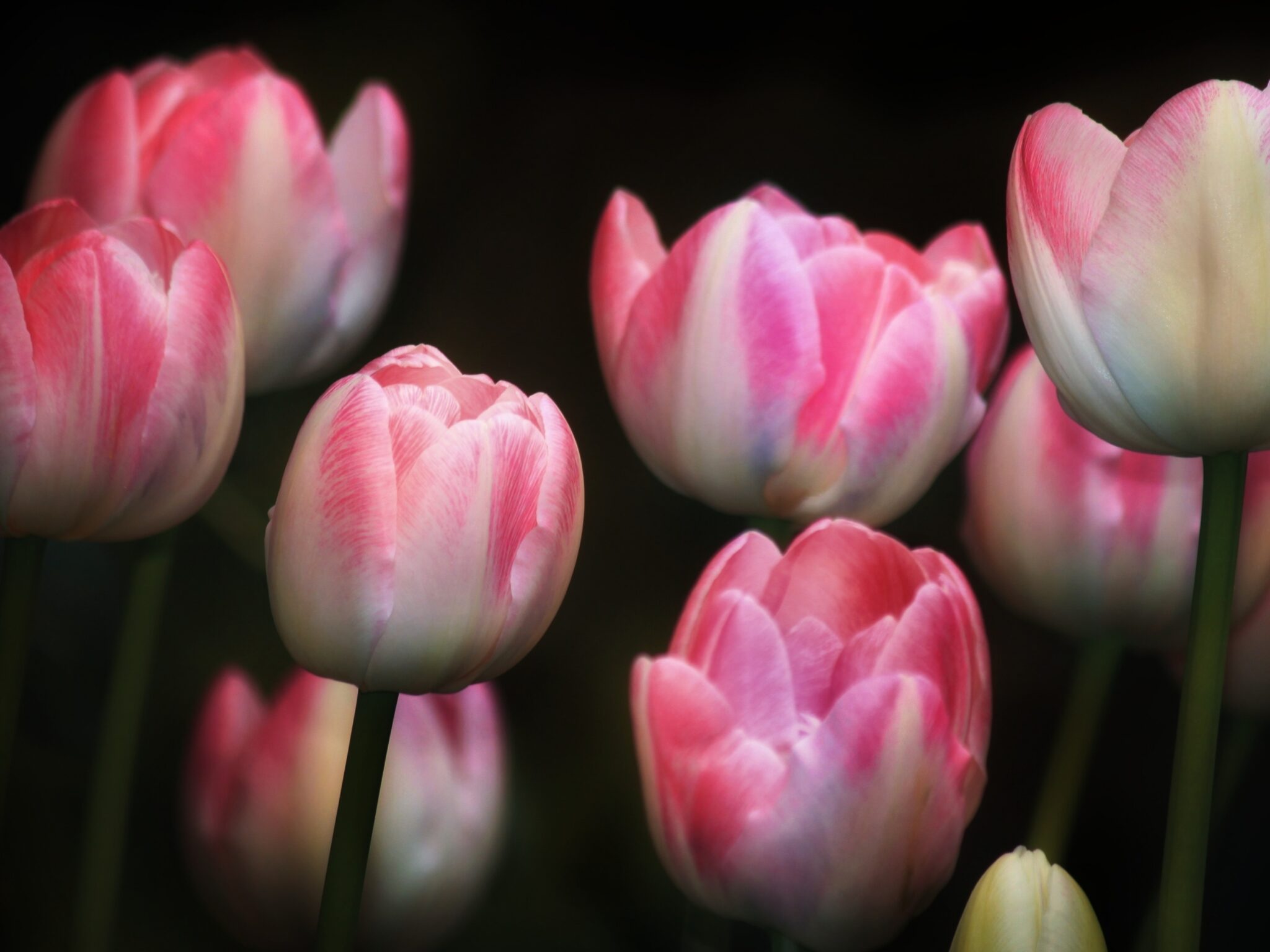 Several pink and white tulips fill the frame, arranged in a loose cluster. Soft, diffused light highlights the delicate textures of the petals against a dark background.