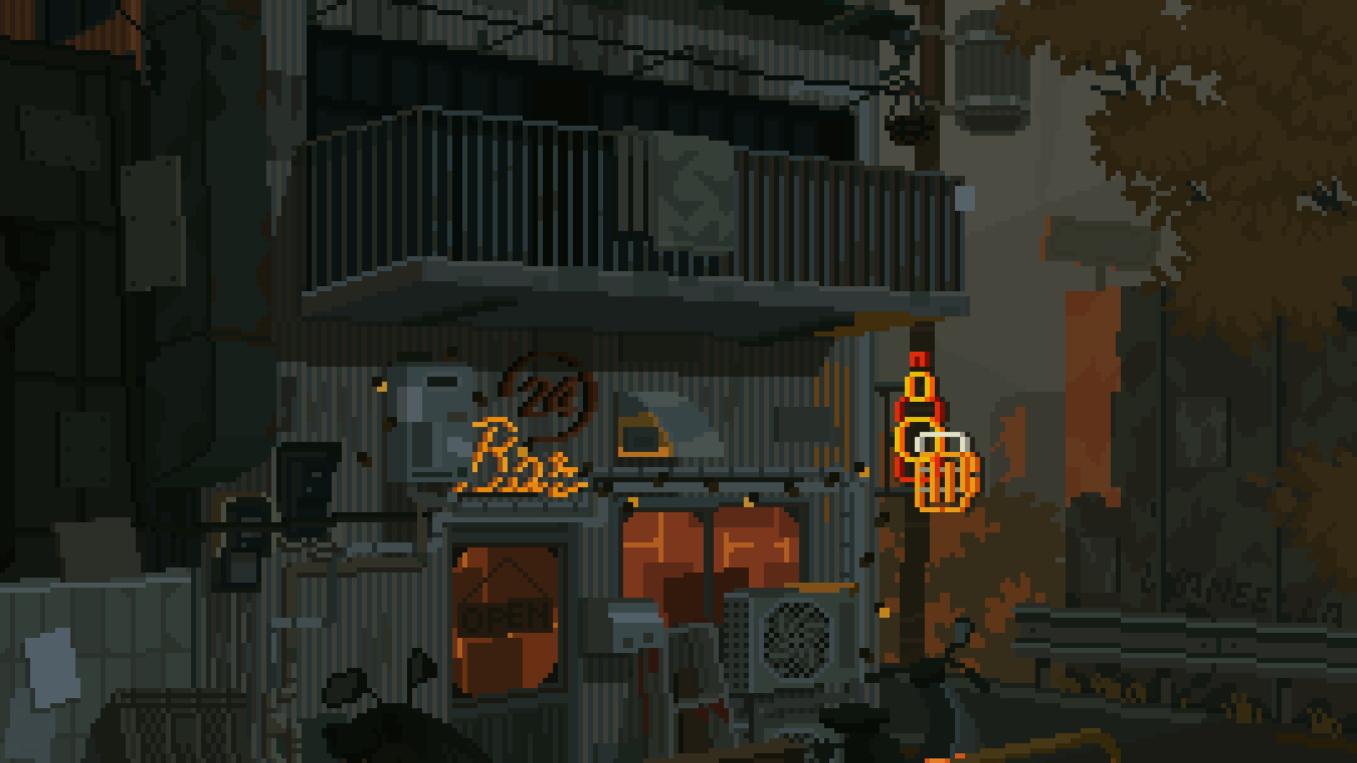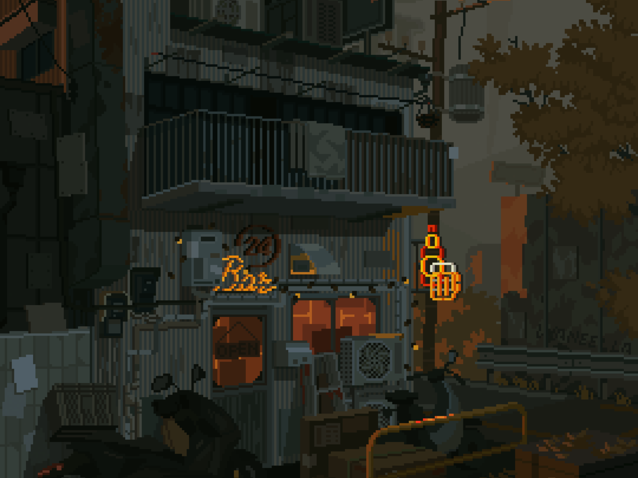 A gritty, pixelated cityscape with crumbling buildings and orange-tinged autumn leaves. Moody and dark, it's a great fit for an OLED phone.
