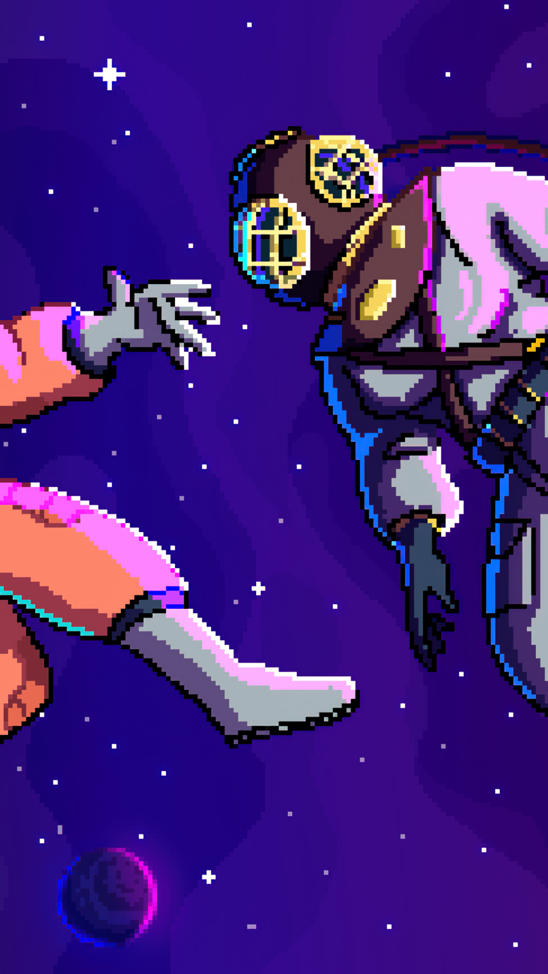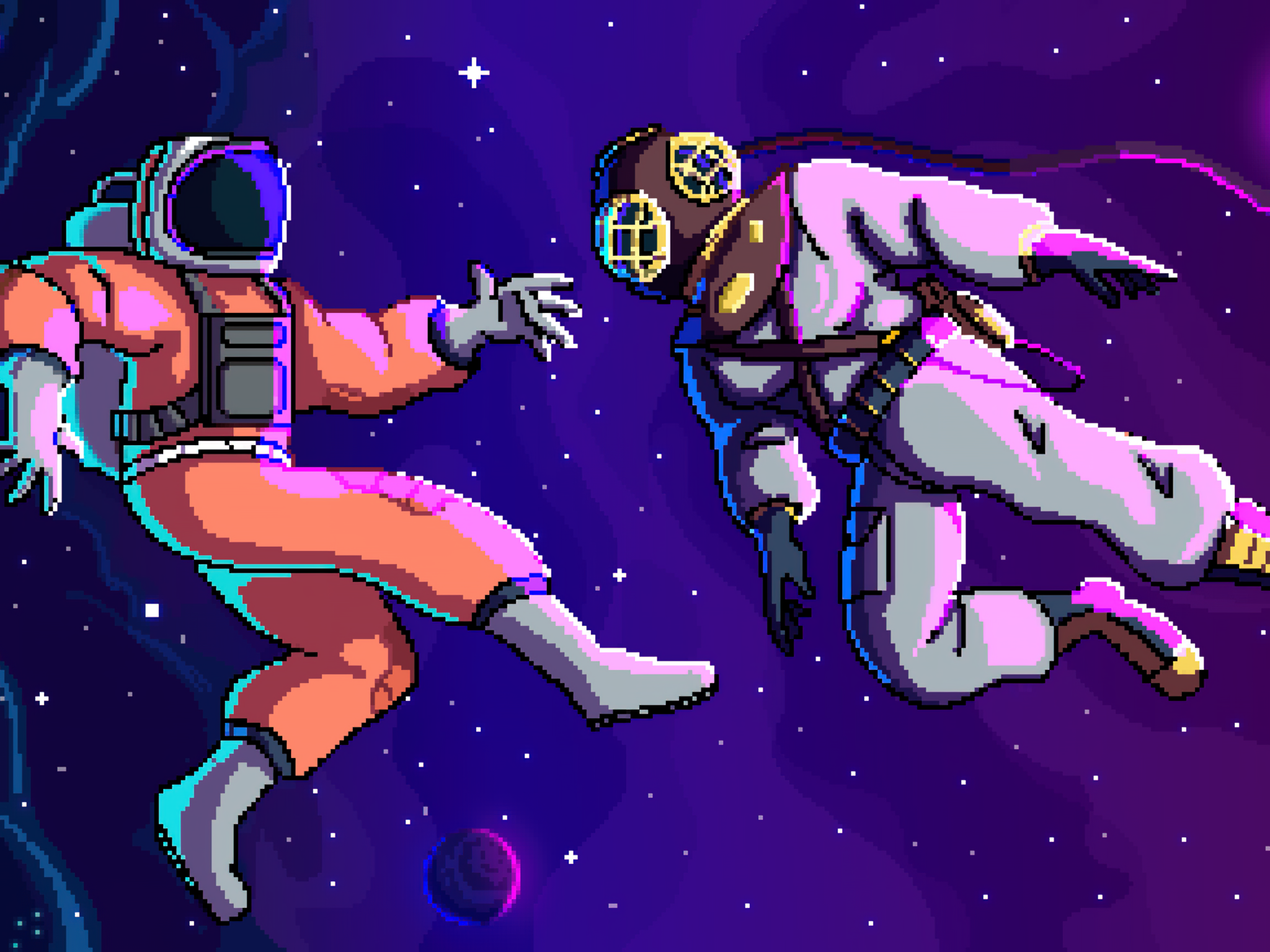 Two pixel art astronauts float through deep space in vibrant orange and white suits against a purple cosmic backdrop dotted with stars and p…