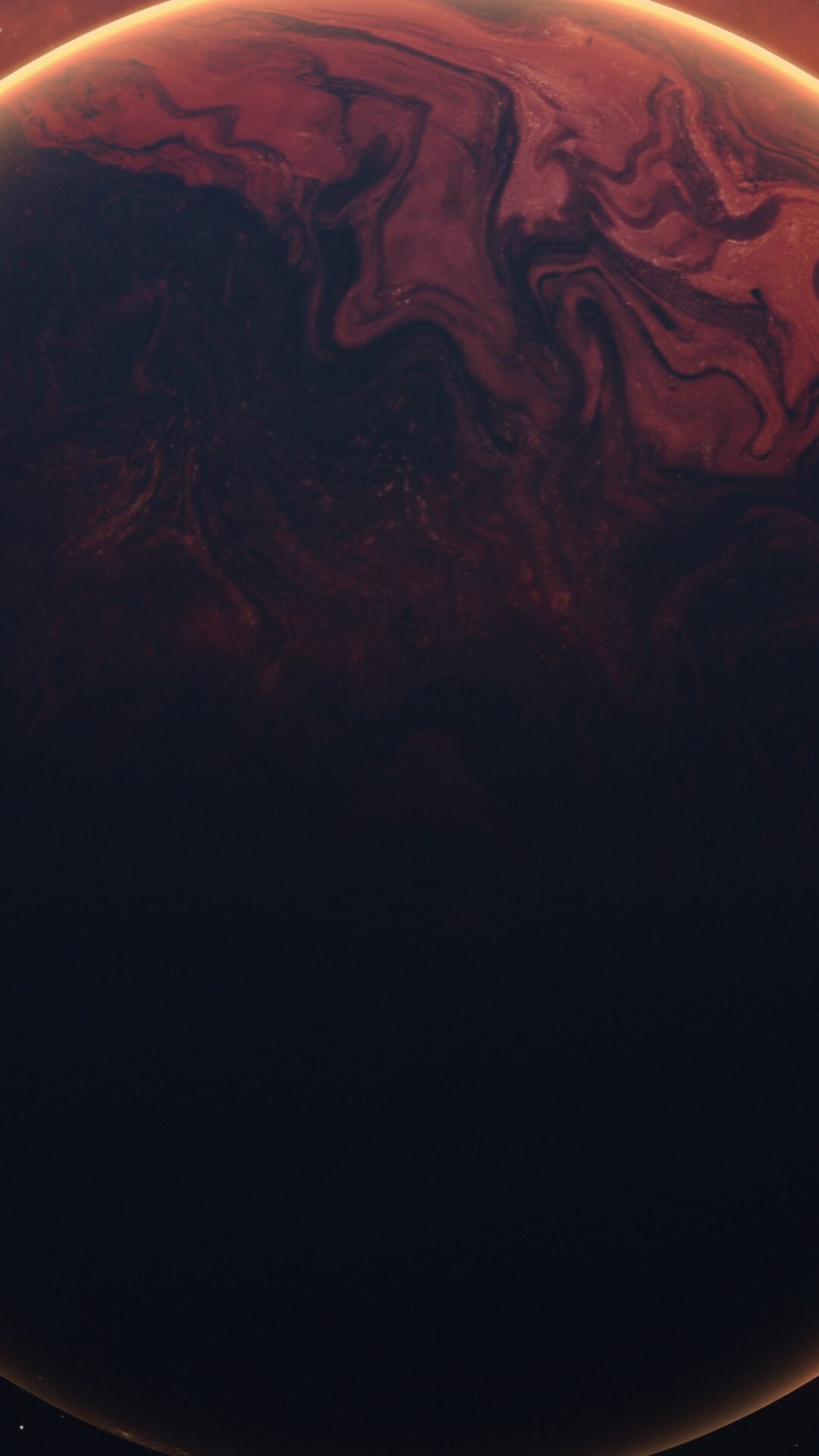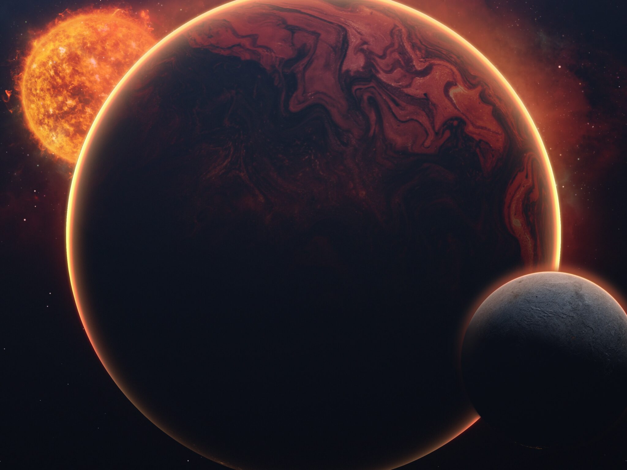 This space scene shows a dark reddish-brown planet with swirling surface patterns orbiting near a bright orange star, with a smaller moon visible in the shadowy foreground. Works well for 4K desktop backgrounds with its dramatic cosmic lighting and rich warm tones.