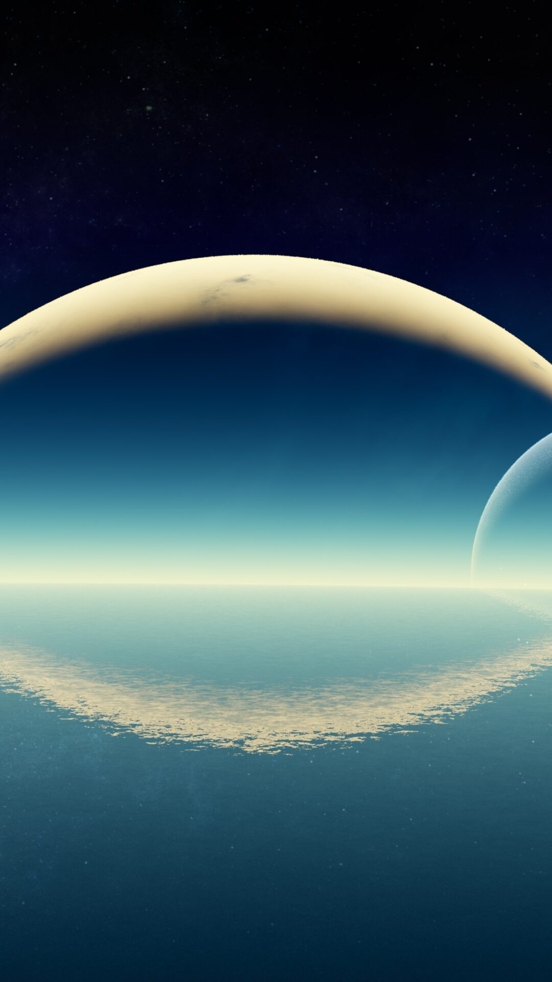 Two massive celestial bodies with cream and blue tones rise above a tranquil alien ocean under a starlit sky. This panoramic space scene wor…