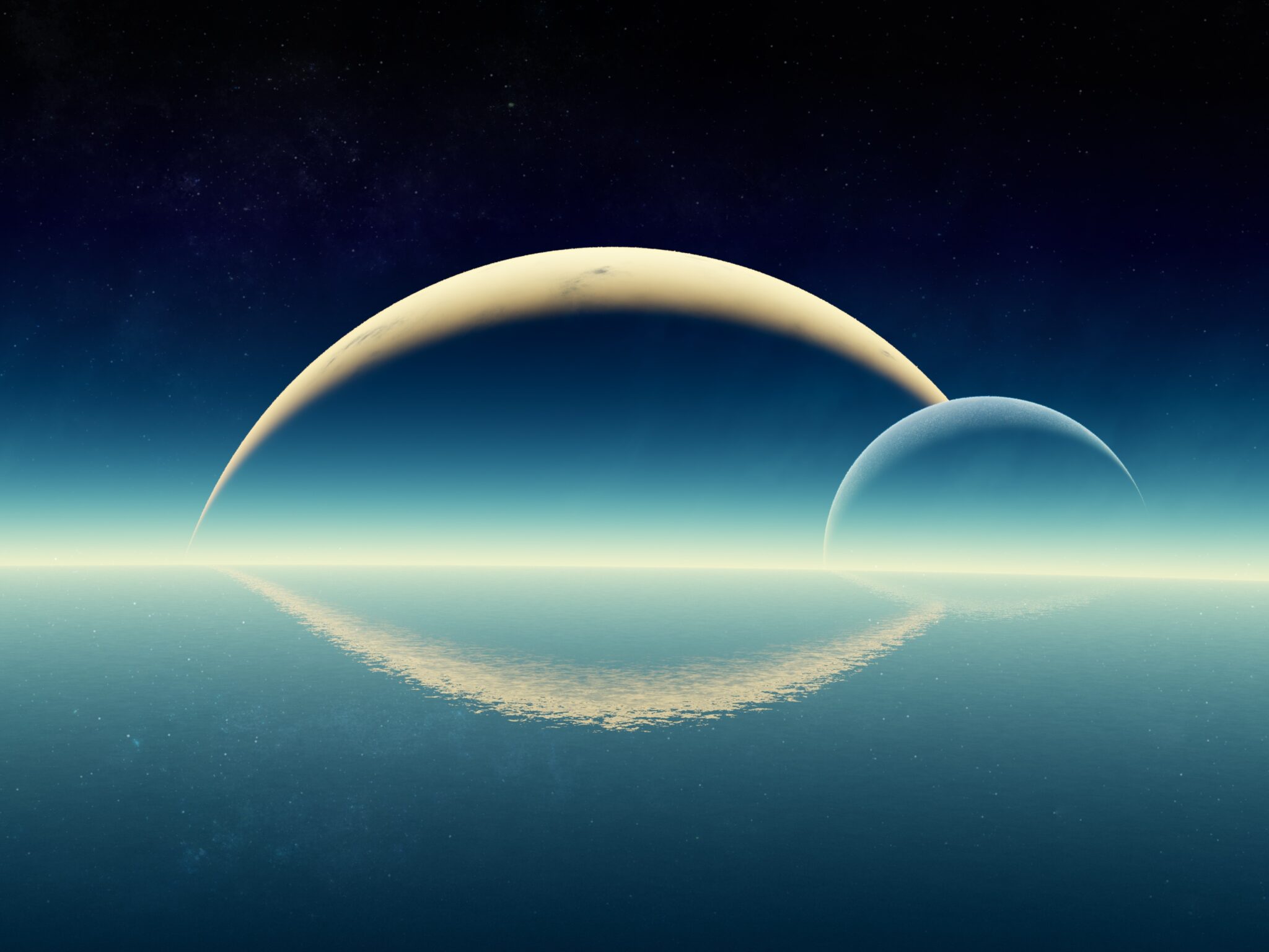 Two massive celestial bodies with cream and blue tones rise above a tranquil alien ocean under a starlit sky. This panoramic space scene works well for ultrawide monitors and desktop backgrounds.