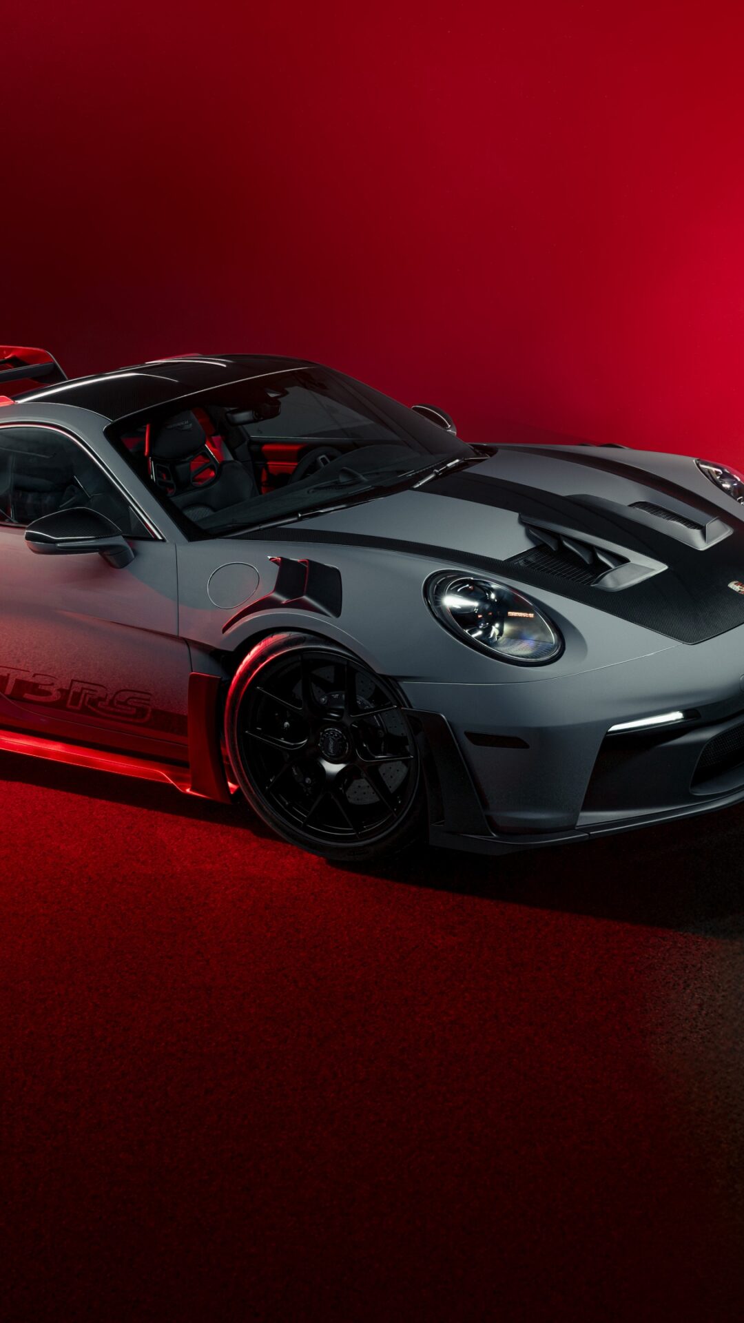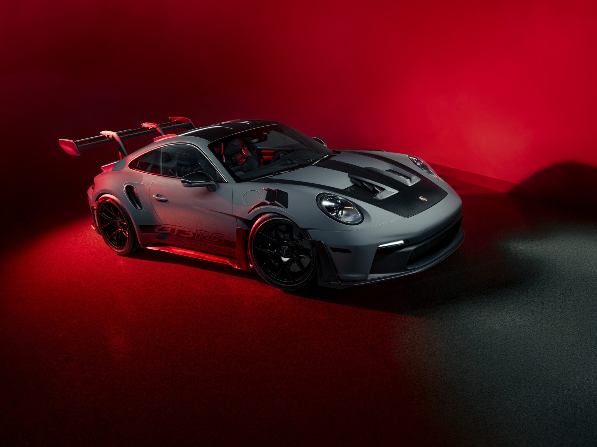 A gray Porsche 911 GT3 is positioned in a dark studio setting with a red backdrop. Dramatic lighting highlights the car's curves and creates…