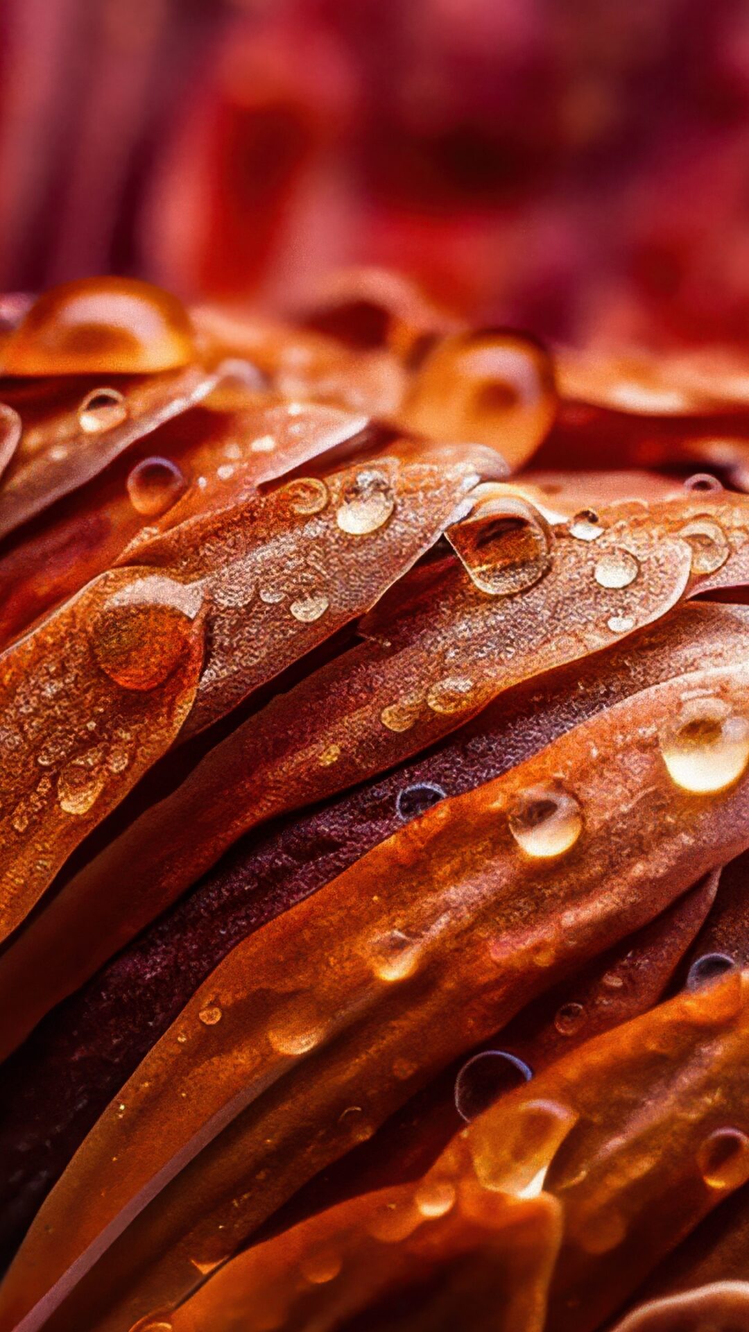 Close-up of protea petals covered in tiny water droplets, showing off burnt orange and rust tones with deep burgundy in the background. For