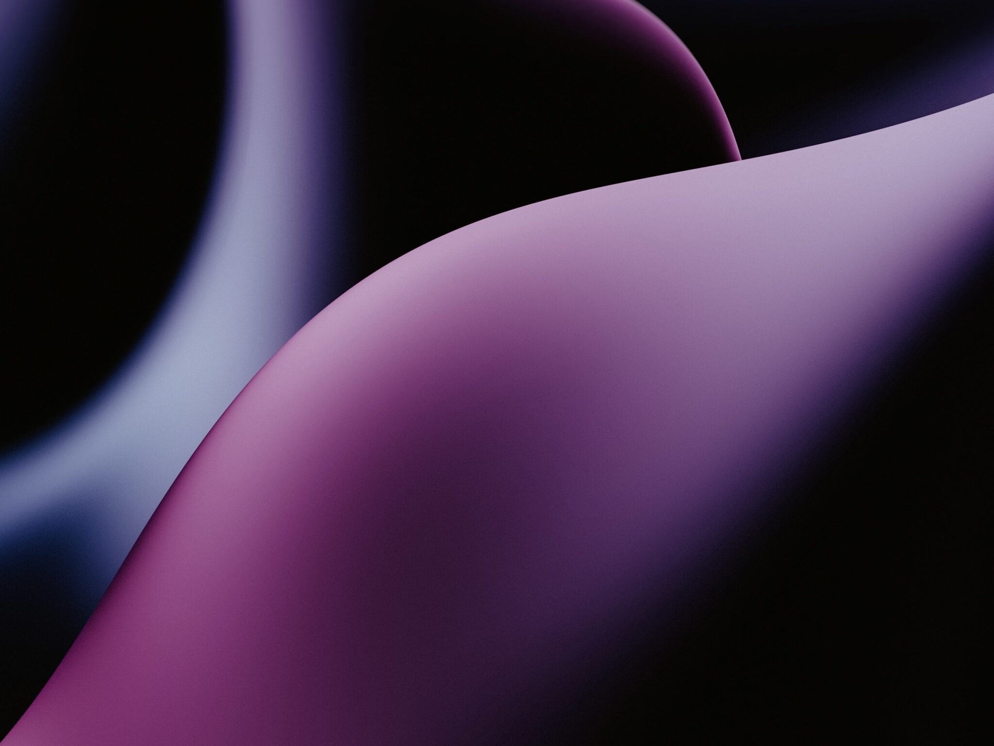 Close-up abstract shapes flow in layered compositions. Smooth gradients of purple and blue create depth with soft, diffused lighting.