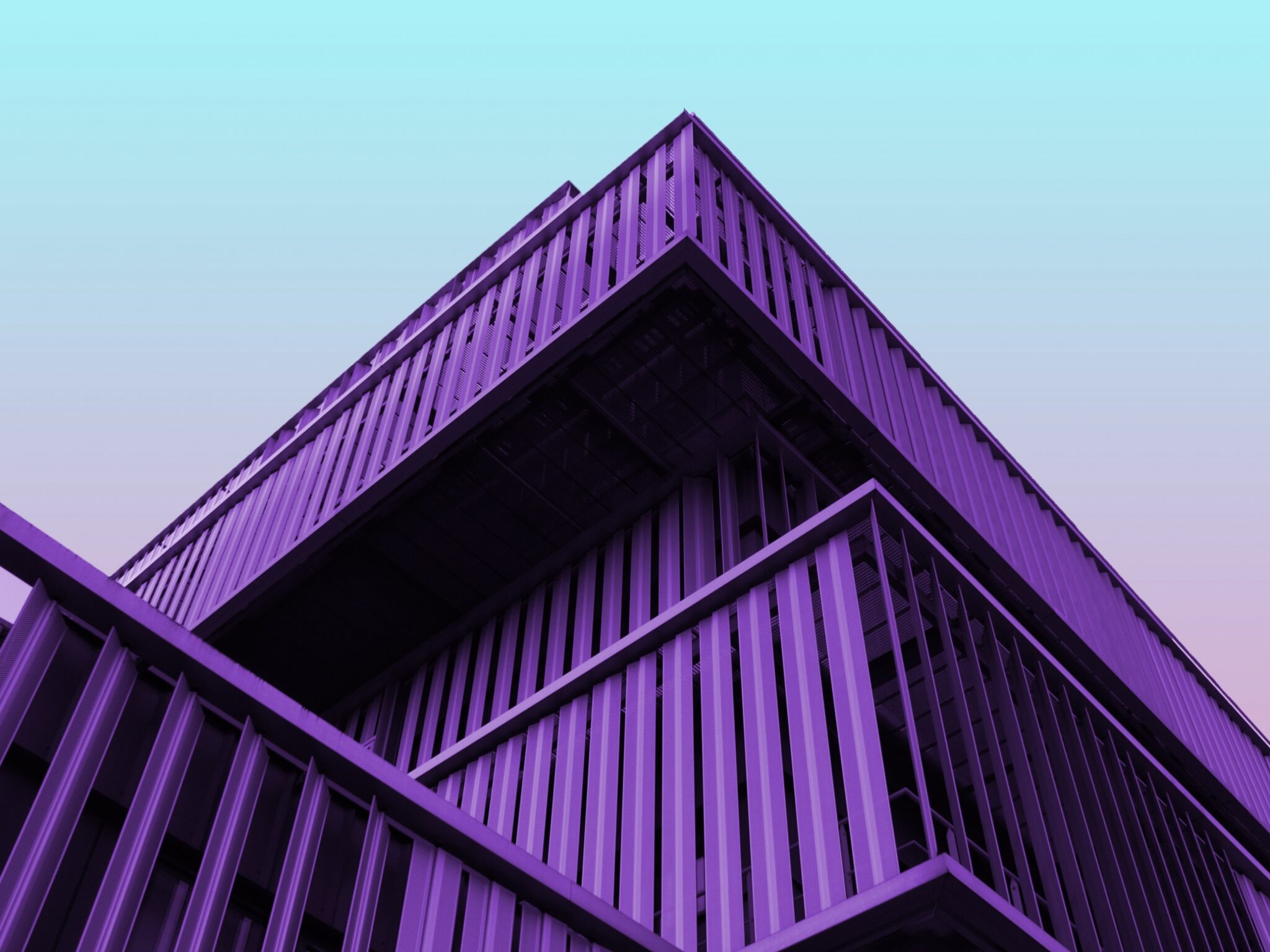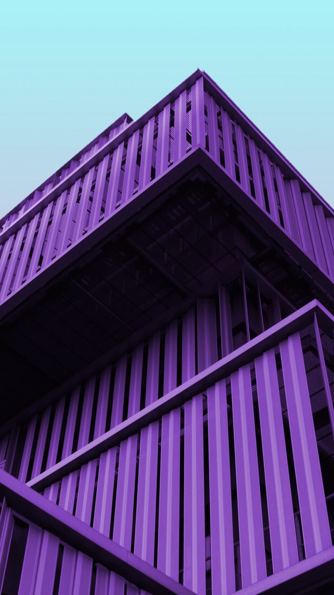 A modern building with a facade of vertical purple slats fills the frame from a low angle. The gradient sky transitions from light blue to s