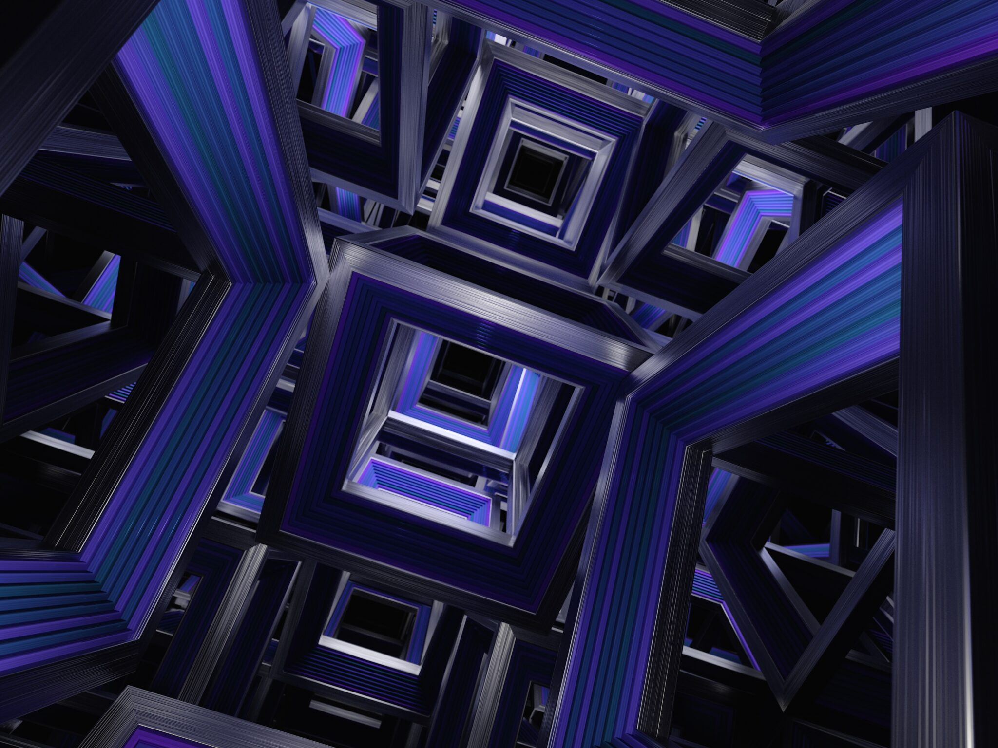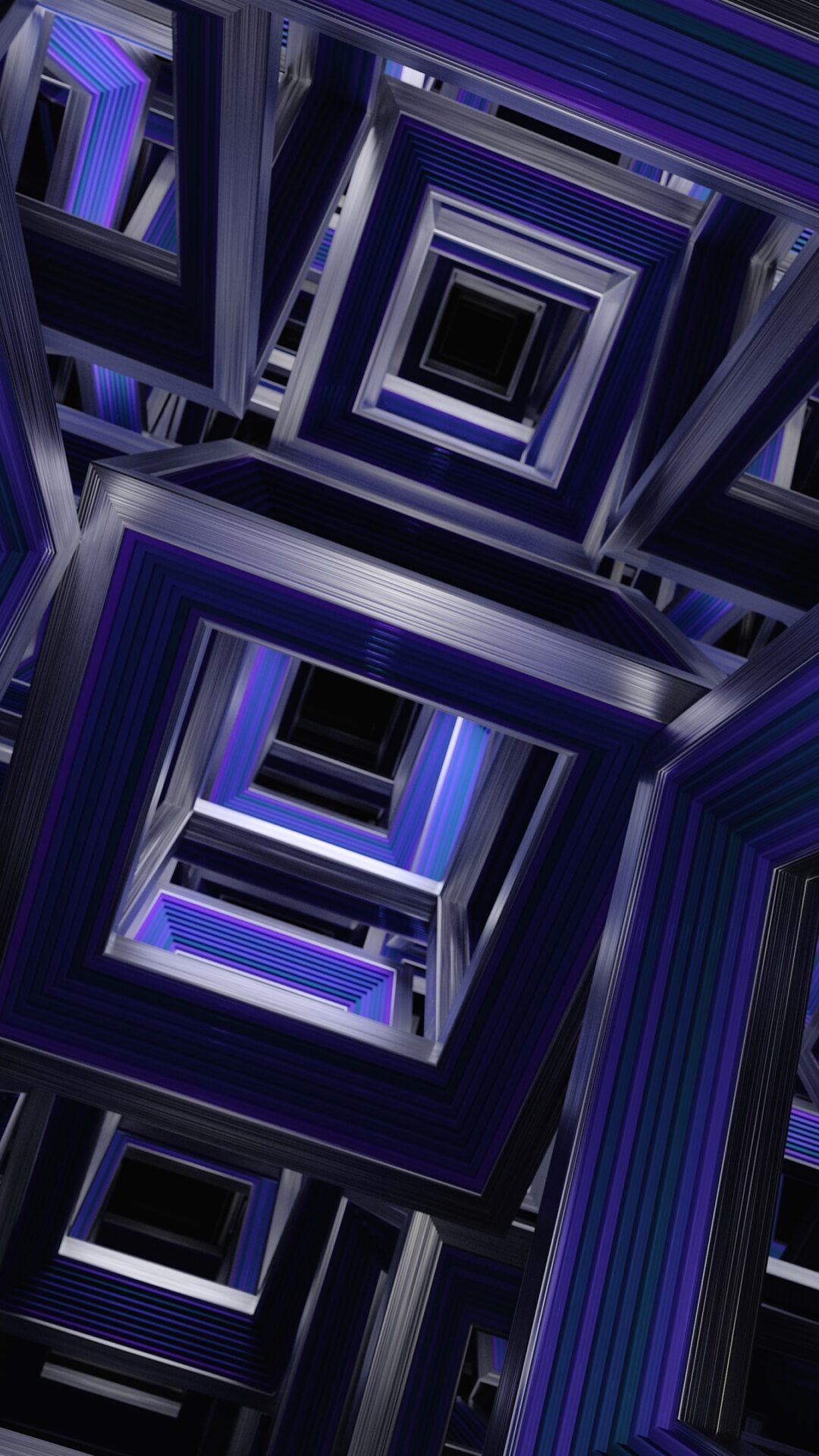 A repeating pattern of dark cuboids and rectangles creates a converging perspective. Blue and purple light gradients catch the edges, sugges