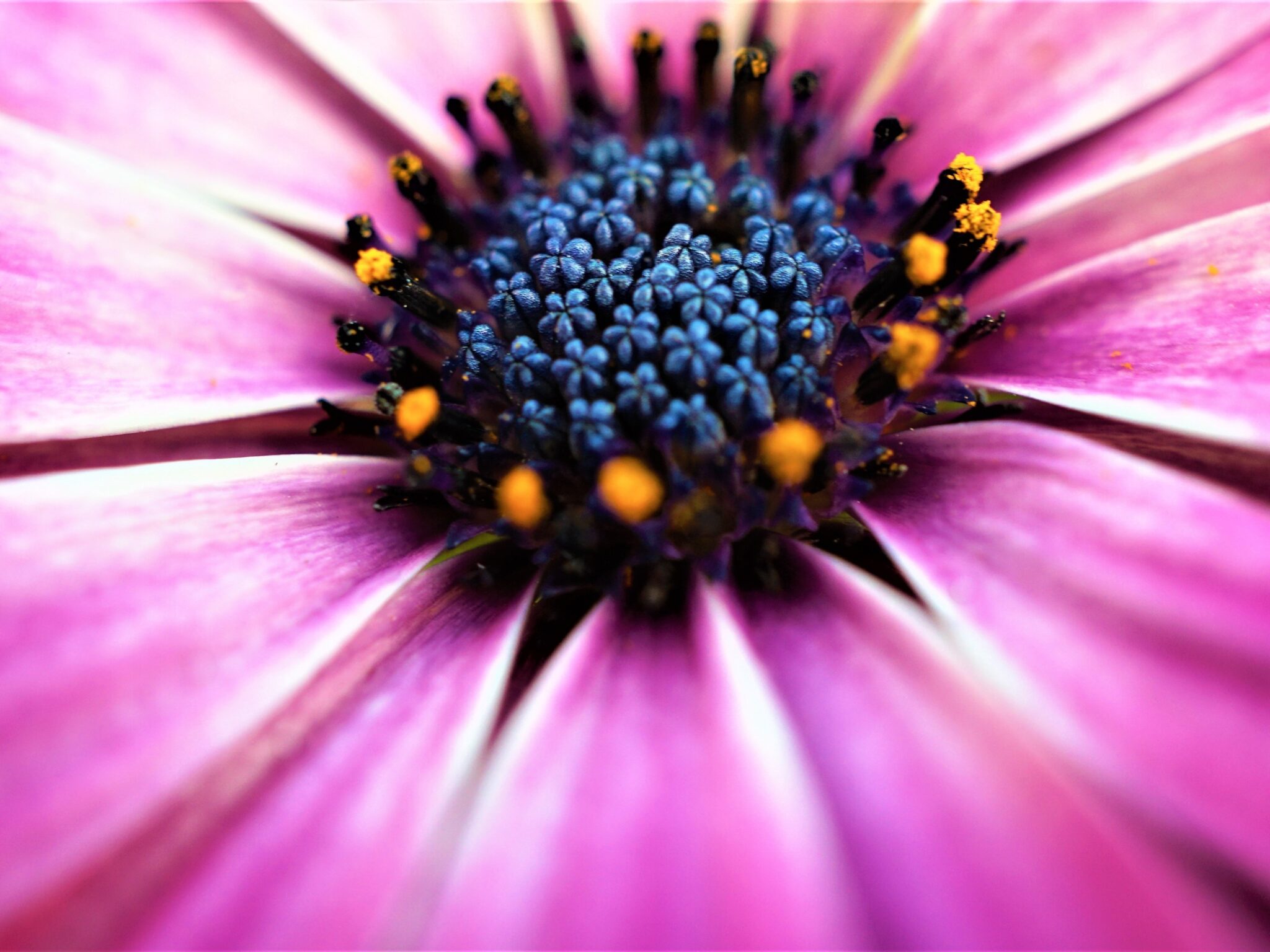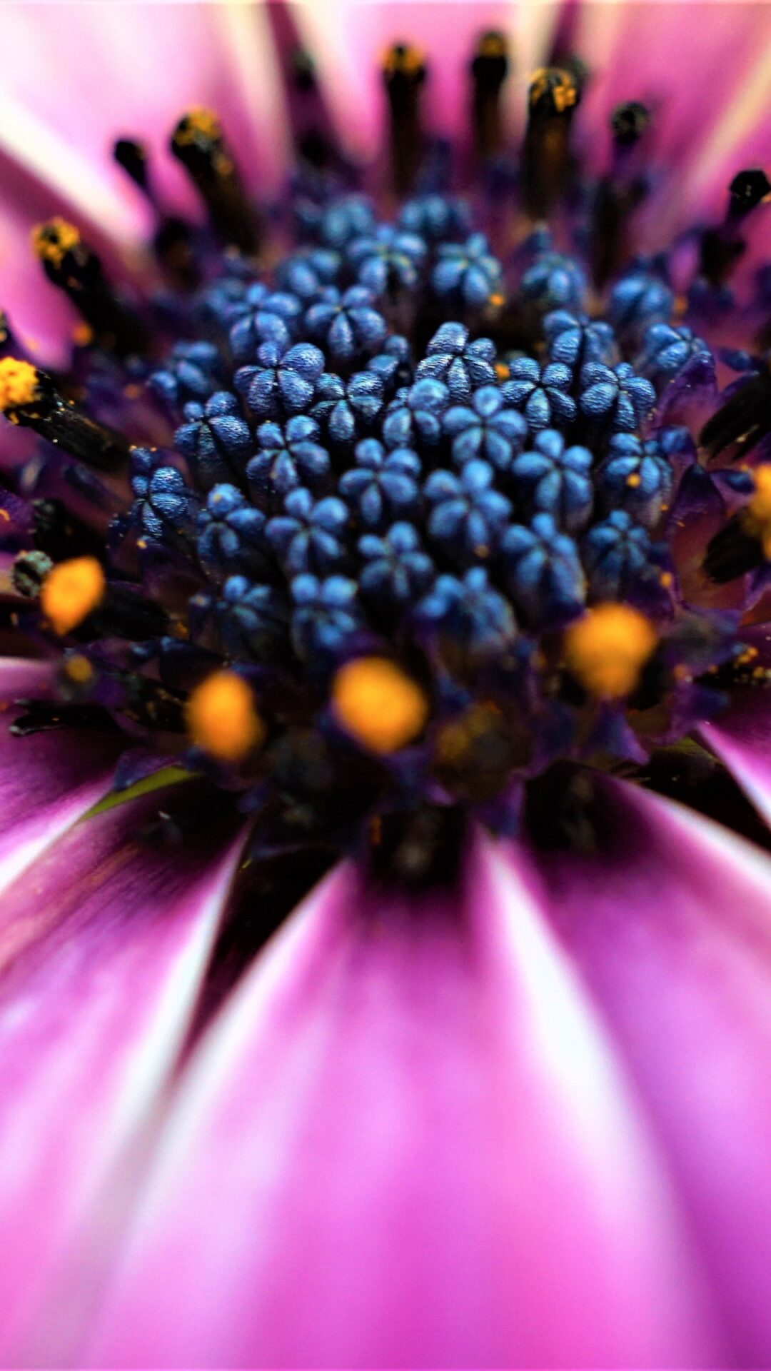 A close-up view centers on the textured core of a daisy, revealing many small florets. The saturated pink petals radiate outwards from the dark blue and yellow central disk, creating a radial composition.