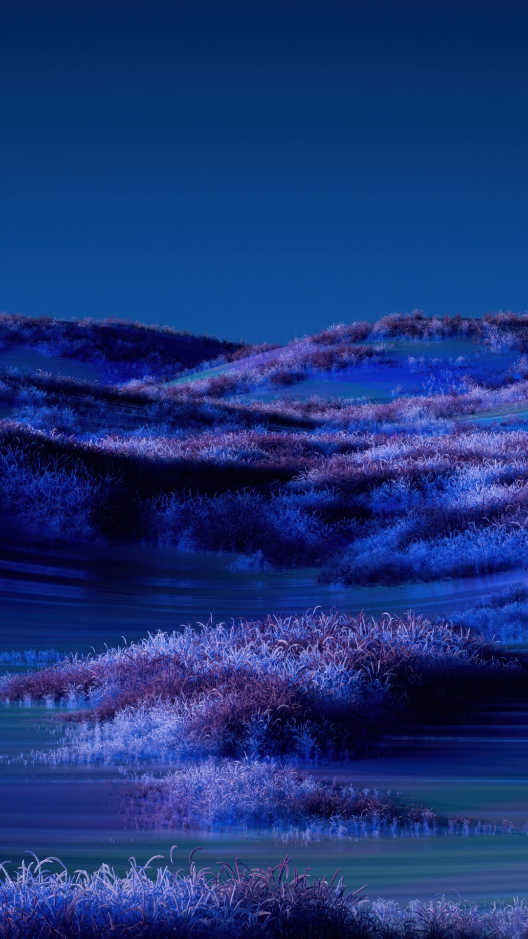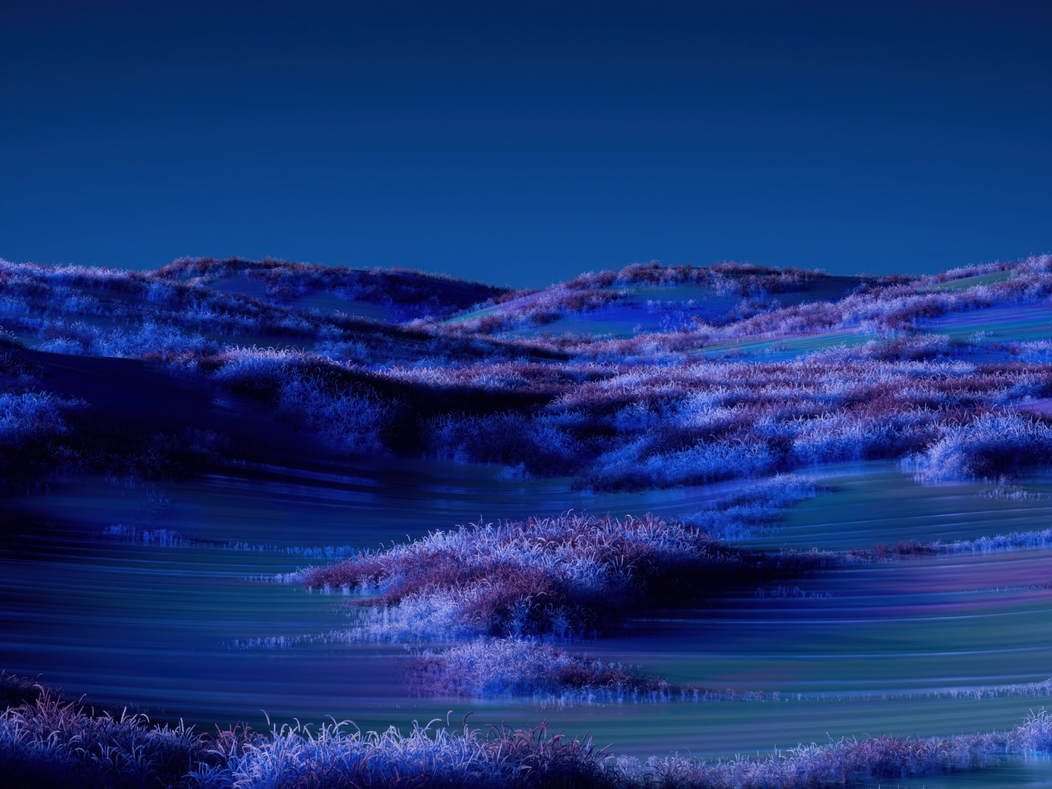 Rolling hills glow in ethereal purple and blue hues under a deep twilight sky, creating a dreamlike landscape that feels almost otherworldly…