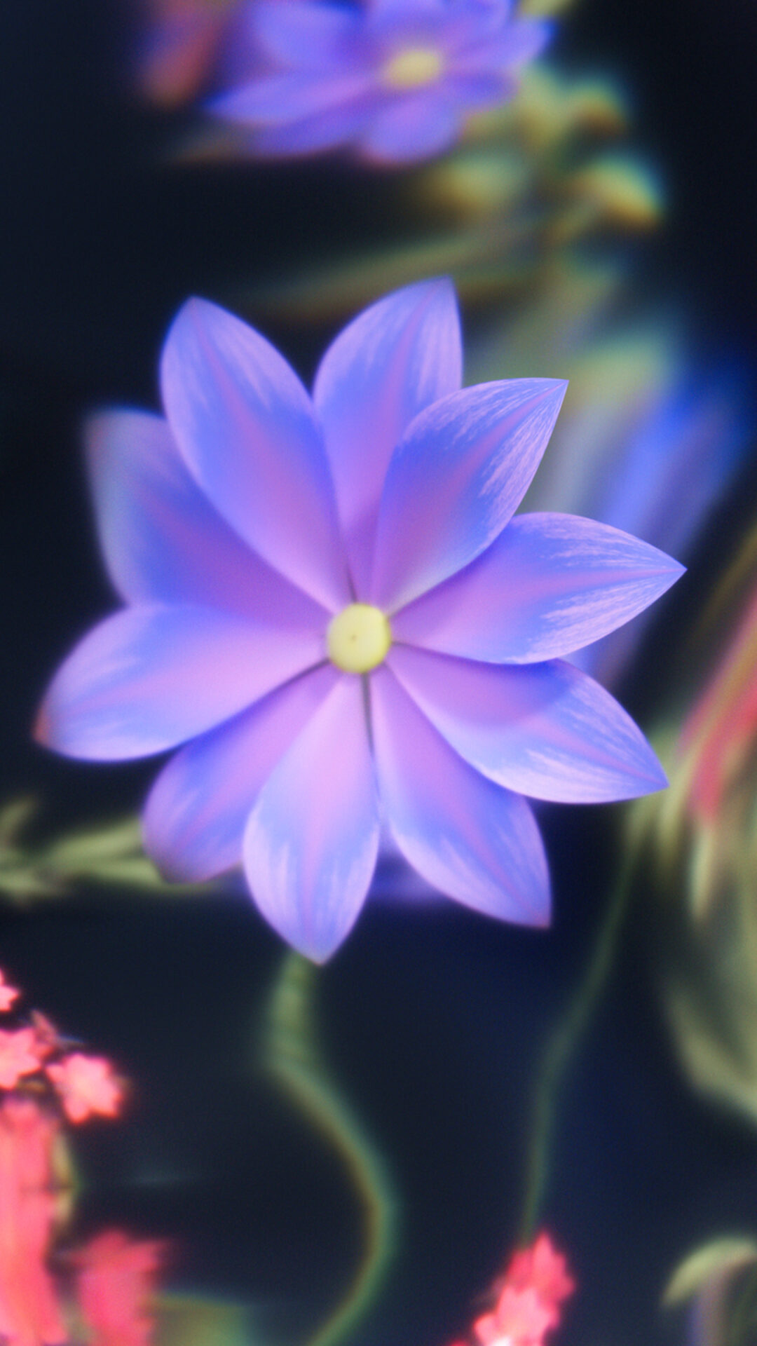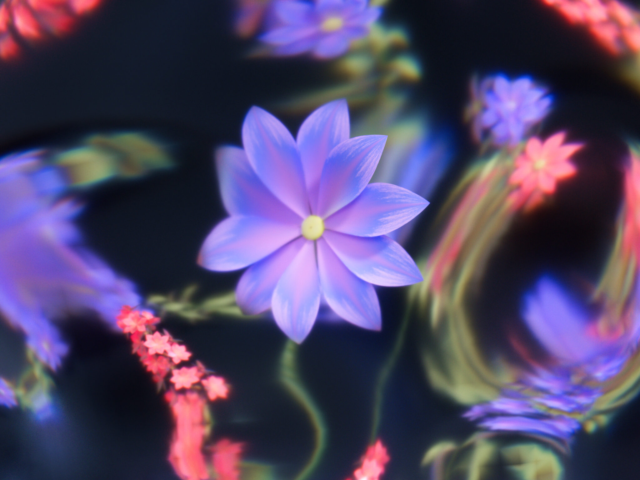 Close-up view of stylized purple and pink flowers against a dark background. Soft, blurred lighting creates a dreamlike, ethereal quality th…
