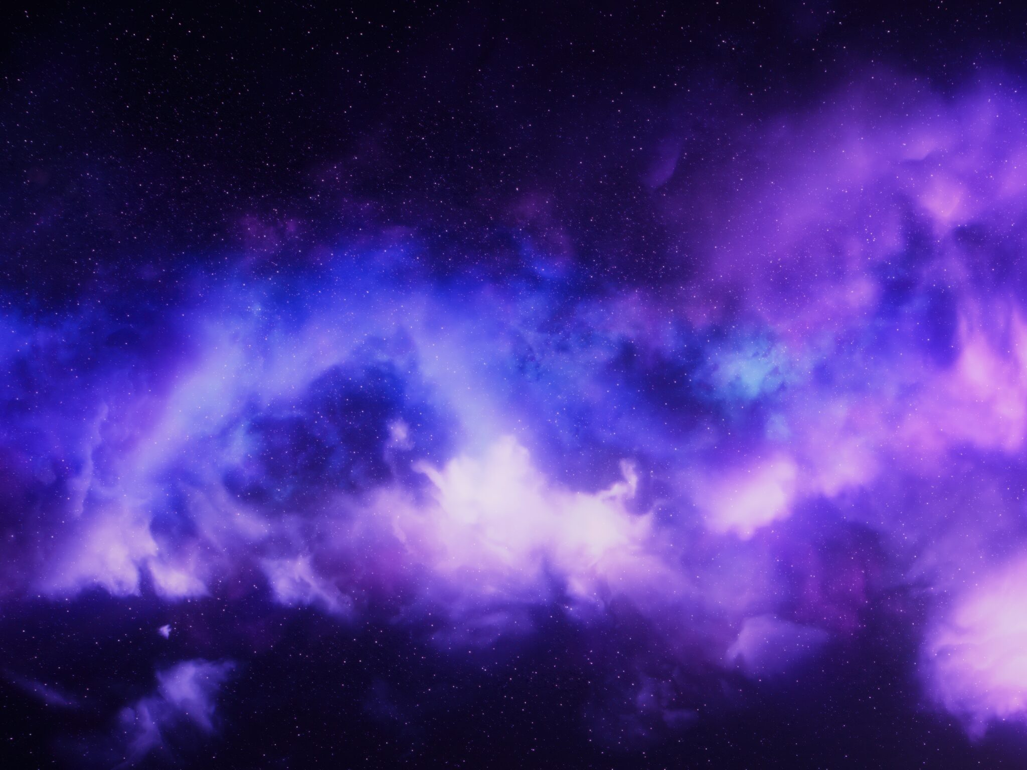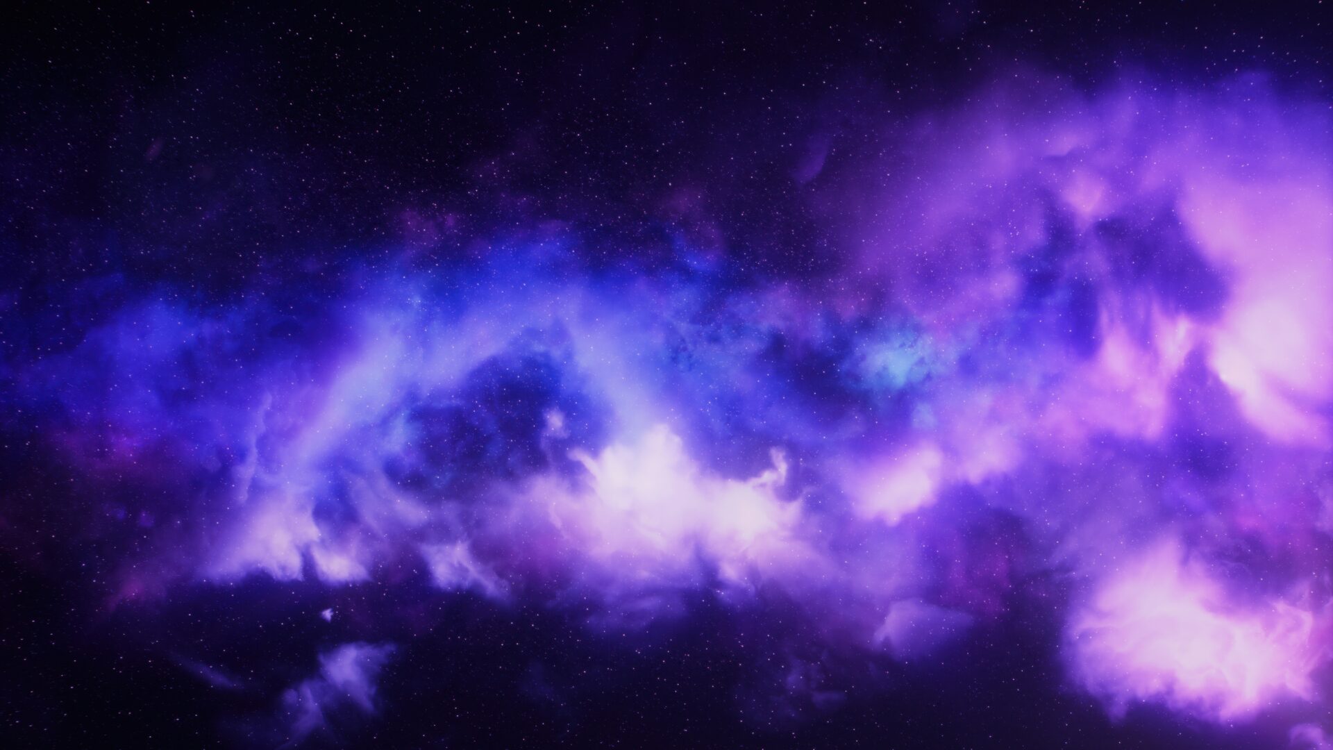Purple and blue cosmic clouds swirl dramatically across a star-filled deep space backdrop, creating mesmerizing nebula formations against th…