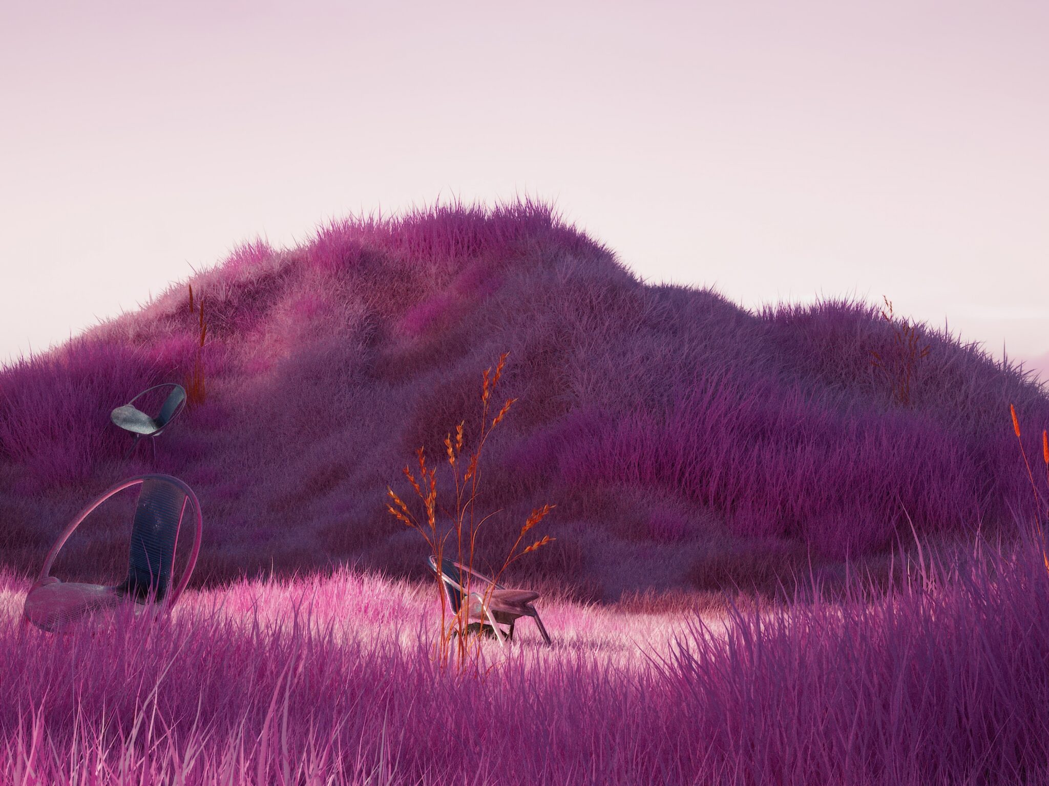 A rolling hill covered in purple grass holds transparent bubble-shaped seats and a small chair. Soft, diffused light creates a hazy atmosphe